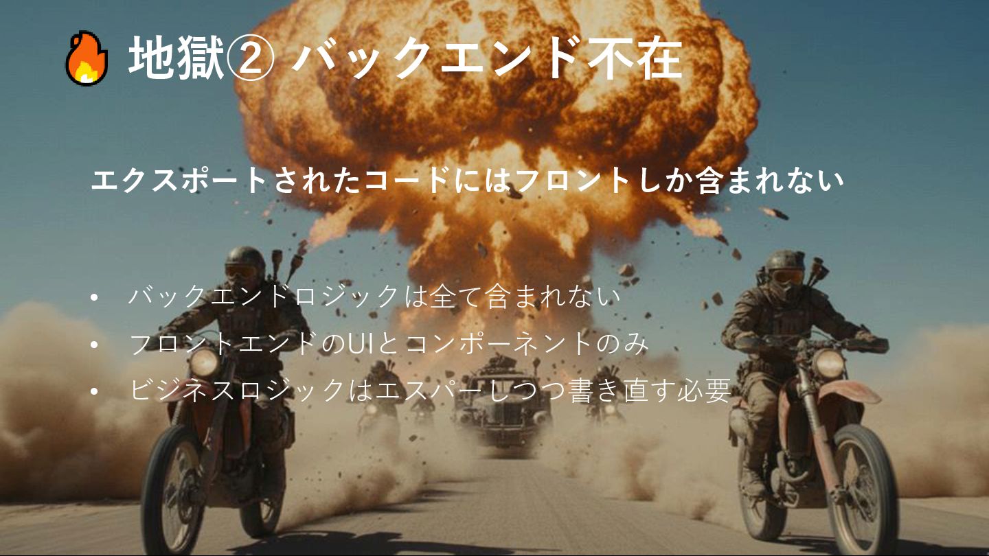 地獄② バックエンド不在 エクスポートされたコードにはフロントしか含まれない • バックエンドロジックは全て含まれない • フロントエンドのUIとコンポーネントのみ • ビジネスロジックはエスパーしつつ書き直す必要