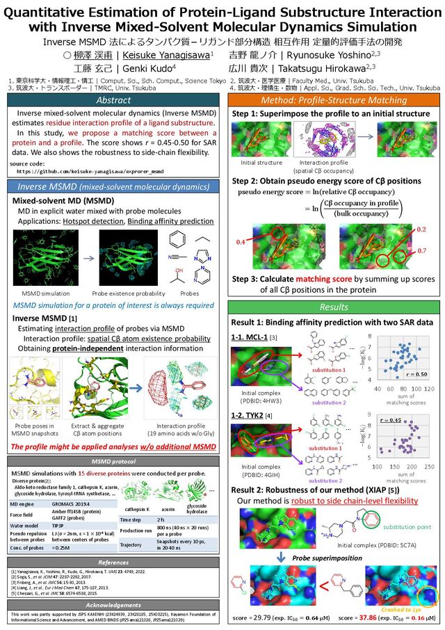 筑波⼤・医学医療 | Faculty Med., Univ. Tsukuba 3. 筑波⼤・トランスボーダー | TMRC, Univ. Tsukuba 4. 筑波⼤・理情⽣・数物 | Appl. Sci., Grad. Sch. Sci. Tech., Univ. Tsukuba Inverse MSMD 法によるタンパク質-リガンド部分構造 相互作用 定量的評価⼿法の開発 This work was partly supported by JSPS KAKENHI (23K24939, 23K28185, 25K03215), Kayamori Foundation of Informational Science and Advancement, and AMED BINDS (JP25ama121026, JP25ama121029). Acknowledgements [1] Yanagisawa, K., Yoshino, R., Kudo, G., Hirokawa, T. IJMS 23: 4749, 2022. [2] Soga, S., et al. JCIM 47: 2287-2292, 2007. [3] Friberg, A., et al. JMC 56: 15-30, 2013. [4] Liang, J., et al., Eur J Med Chem 67, 175-187, 2013. [5] Chessari, G., et al. JMC 58: 6574-6588, 2015. References 柳澤 渓甫 | Keisuke Yanagisawa1 ◦ 吉野 龍ノ介 | Ryunosuke Yoshino2,3 ⼯藤 玄己 | Genki Kudo4 広川 貴次 | Takatsugu Hirokawa2,3 Inverse mixed-solvent molecular dynamics (Inverse MSMD) estimates residue interaction profile of a ligand substructure. In this study, we propose a matching score between a protein and a profile. The score shows r = 0.45-0.50 for SAR data. We also shows the robustness to side-chain flexibility. Abstract https://github.com/keisuke-yanagisawa/exprorer_msmd source code: MSMD protocol MD engine GROMACS 2019.4 Force field Amber ff14SB (protein) GAFF2 (probes) Water model TIP3P Pseudo repulsion between probes LJ (σ = 2nm, ε = 1 10-6 kcal) between centers of probes Conc. of probes ≈ 0.25M Time step 2 fs Production run 800 ns (40 ns 20 runs) per a probe Trajectory Snapshots every 10 ps, in 20-40 ns MSMD simulations with 15 diverse proteins were conducted per probe. Inverse MSMD (mixed-solvent molecular dynamics) Method: Profile-Structure Matching Results Mixed-solvent MD (MSMD) MD in explicit water mixed with probe molecules Applications: Hotspot detection, Binding affinity prediction MSMD simulation Probe existence probability Probes Probe poses in MSMD snapshots Extract & aggregate Cβ atom positions Interaction profile (19 amino acids w/o Gly) Inverse MSMD [1] Estimating interaction profile of probes via MSMD Interaction profile: spatial Cβ atom existence probability Obtaining protein-independent interaction information MSMD simulation for a protein of interest is always required The profile might be applied analyses w/o additional MSMD Result 1: Binding affinity prediction with two SAR data Result 2: Robustness of our method (XIAP [5]) Our method is robust to side chain-level flexibility Initial complex (PDBID: 5C7A) N Cl Crashed to Lys substitution point score = 29.79 (exp. IC 𝟎. 𝟔𝟒 μM) score = 37.86 (exp. IC 𝟎. 𝟏𝟔 μM) < Probe superimposition 4 5 6 7 8 40 60 80 100 120 log K sum of matching scores substitution 1 substitution 2 Initial complex (PDBID: 4HW3) … … Step 1: Superimpose the profile to an initial structure Step 2: Obtain pseudo energy score of Cβ positions pseudo energy score ln relative Cβ occupancy Step 3: Calculate matching score by summing up scores of all Cβ positions in the protein 0.7 0.2 0.4 Initial structure Interaction profile (spatial Cβ occupancy) ln Cβ occupancy in profile bulk occupancy 𝒓 𝟎. 𝟓𝟎 1-1. MCL-1 [3] log K sum of matching scores substitution 1 substitution 2 Initial complex (PDBID: 4GIH) … … 𝒓 𝟎. 𝟓𝟎 1-2. TYK2 [4] Diverse protein[2]: Aldo-keto reductase family 1, cathepsin K, azurin, glycoside hydrolase, tyrosyl-tRNA synthetase, … cathepsin K azurin glycoside hydrolase … 5 6 7 8 9 100 150 200 250 𝒓 𝟎. 𝟒𝟓 Quantitative Estimation of Protein-Ligand Substructure Interaction with Inverse Mixed-Solvent Molecular Dynamics Simulation Quantitative Estimation of Protein-Ligand Substructure Interaction with Inverse Mixed-Solvent Molecular Dynamics Simulation