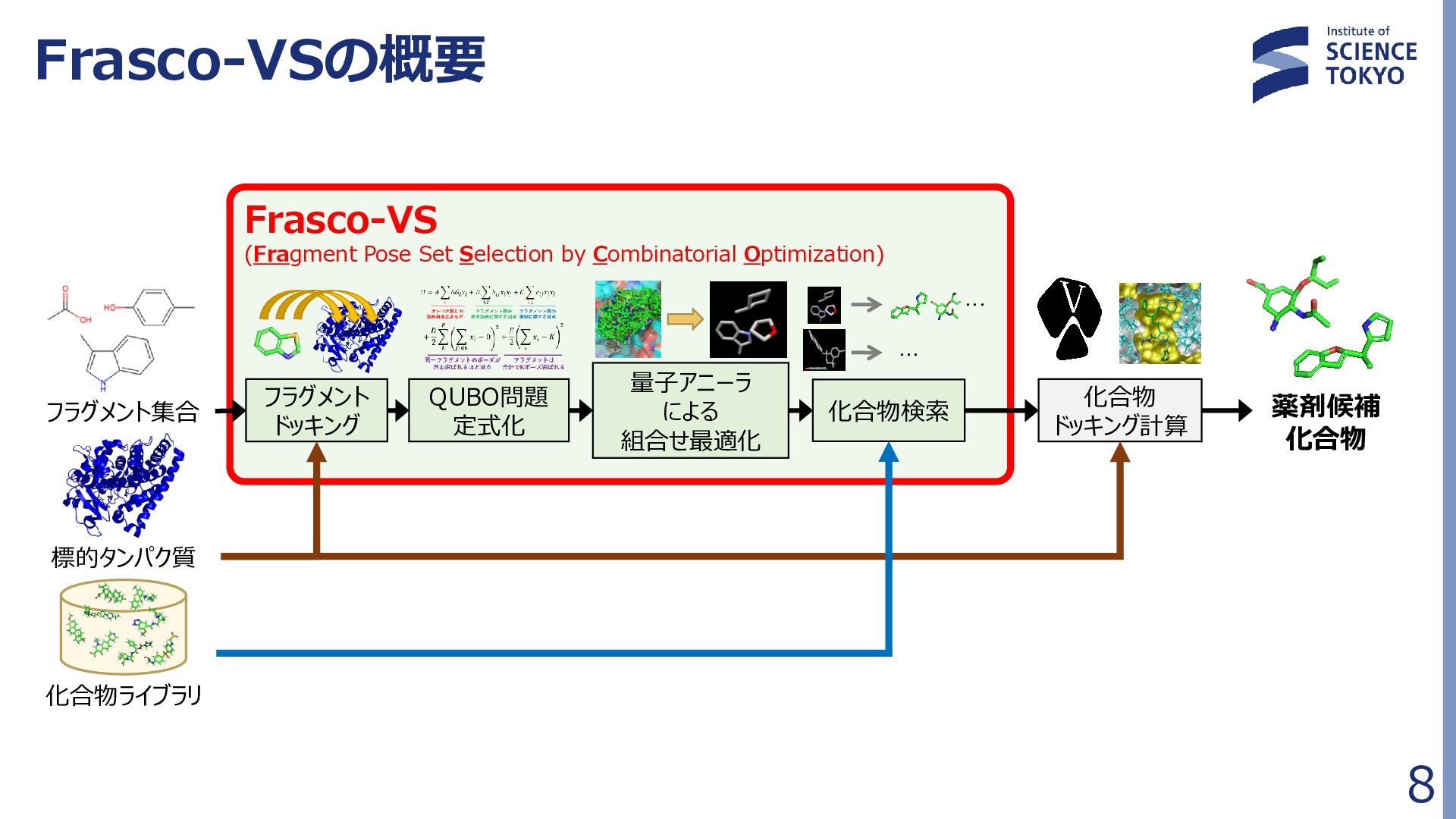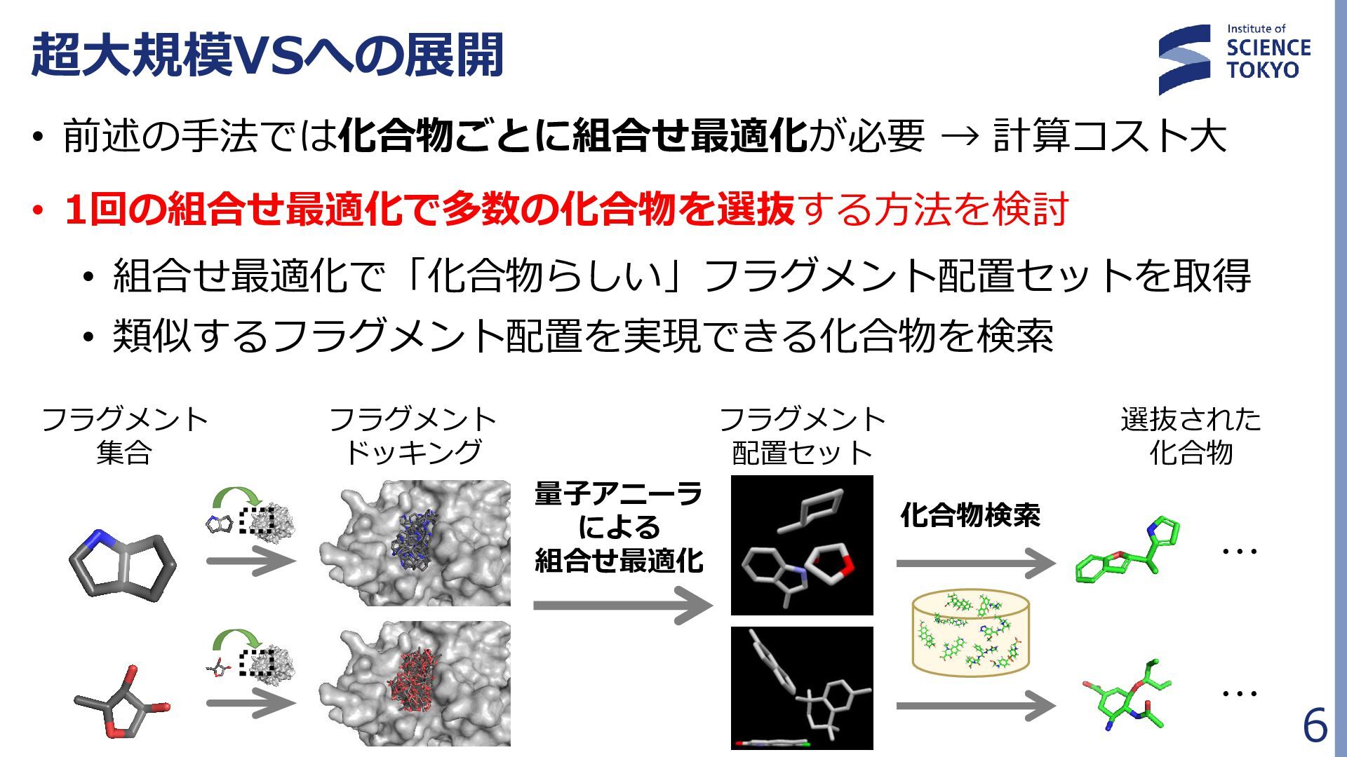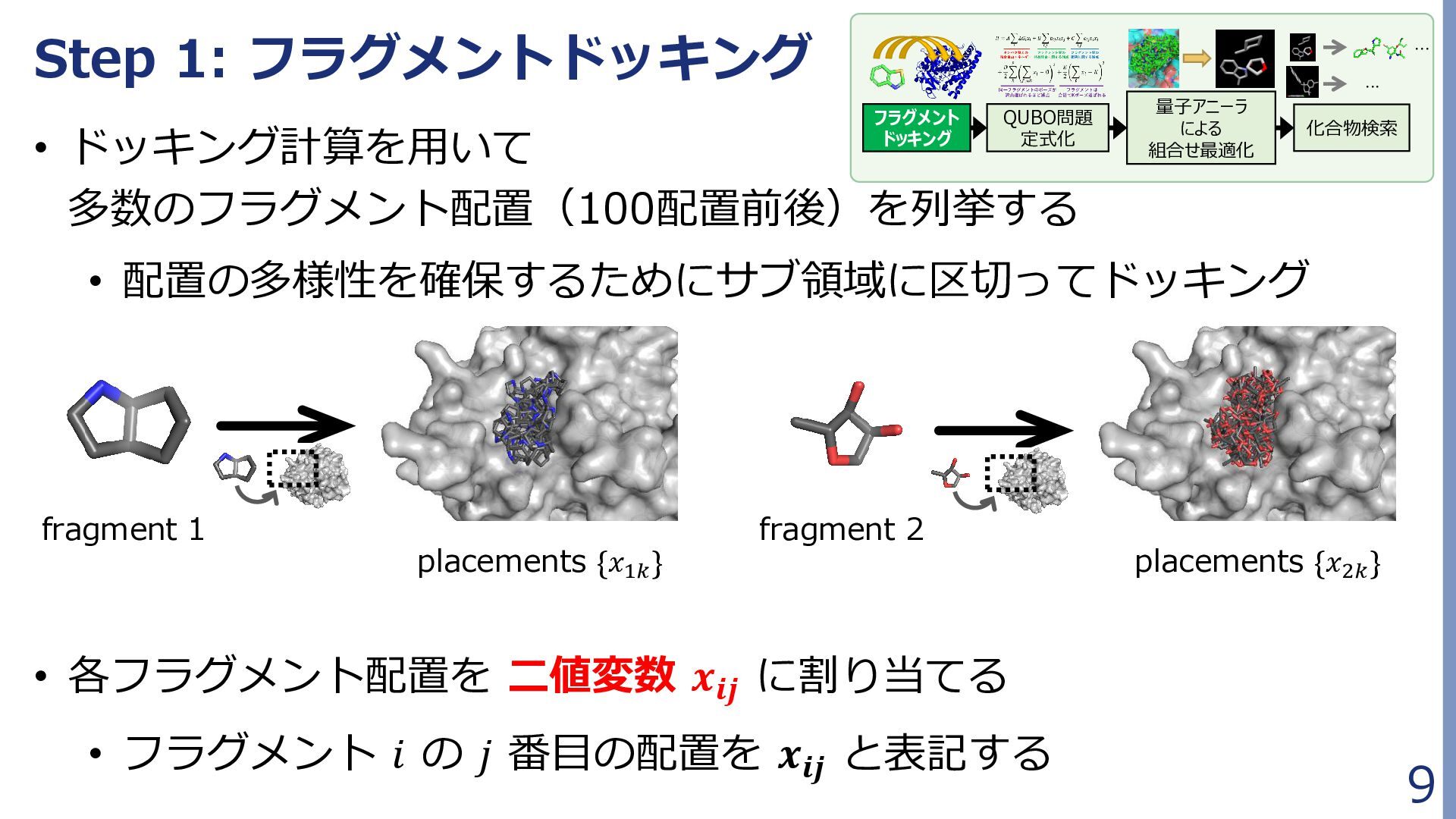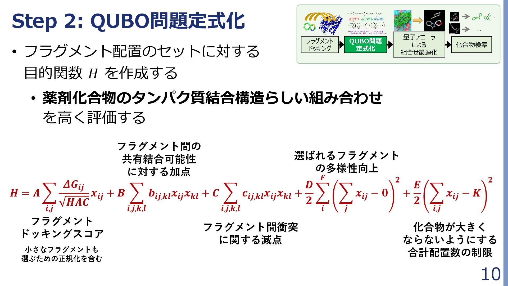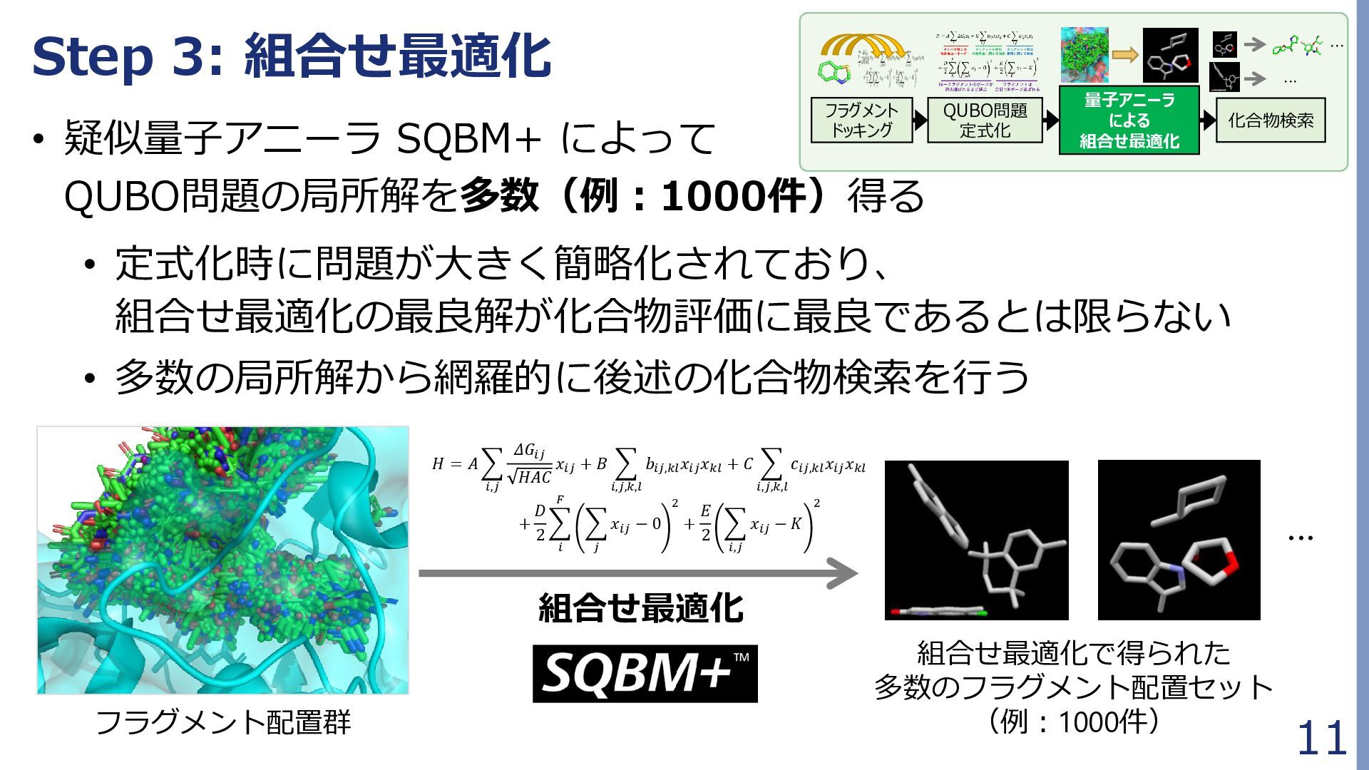 定式化時に問題が大きく簡略化されており、 組合せ最適化の最良解が化合物評価に最良であるとは限らない • 多数の局所解から網羅的に後述の化合物検索を行う Fragment docking QUBO formulation Compound retrieval ・・ ・ ・ ・ ・ Combinatorial Optimization by QA フラグメント配置群 組合せ最適化で得られた 多数のフラグメント配置セット (例:1000件) … 𝐻 = 𝐴 𝑖,𝑗 𝛥𝐺𝑖𝑗 𝐻𝐴𝐶 𝑥𝑖𝑗 + 𝐵 𝑖,𝑗,𝑘,𝑙 𝑏𝑖𝑗,𝑘𝑙 𝑥𝑖𝑗 𝑥𝑘𝑙 + 𝐶 𝑖,𝑗,𝑘,𝑙 𝑐𝑖𝑗,𝑘𝑙 𝑥𝑖𝑗 𝑥𝑘𝑙 + 𝐷 2 𝑖 𝐹 𝑗 𝑥𝑖𝑗 − 0 2 + 𝐸 2 𝑖,𝑗 𝑥𝑖𝑗 − 𝐾 2 組合せ最適化 フラグメント ドッキング QUBO問題 定式化 化合物検索 ・・・ ・・・ 量子アニーラ による 組合せ最適化