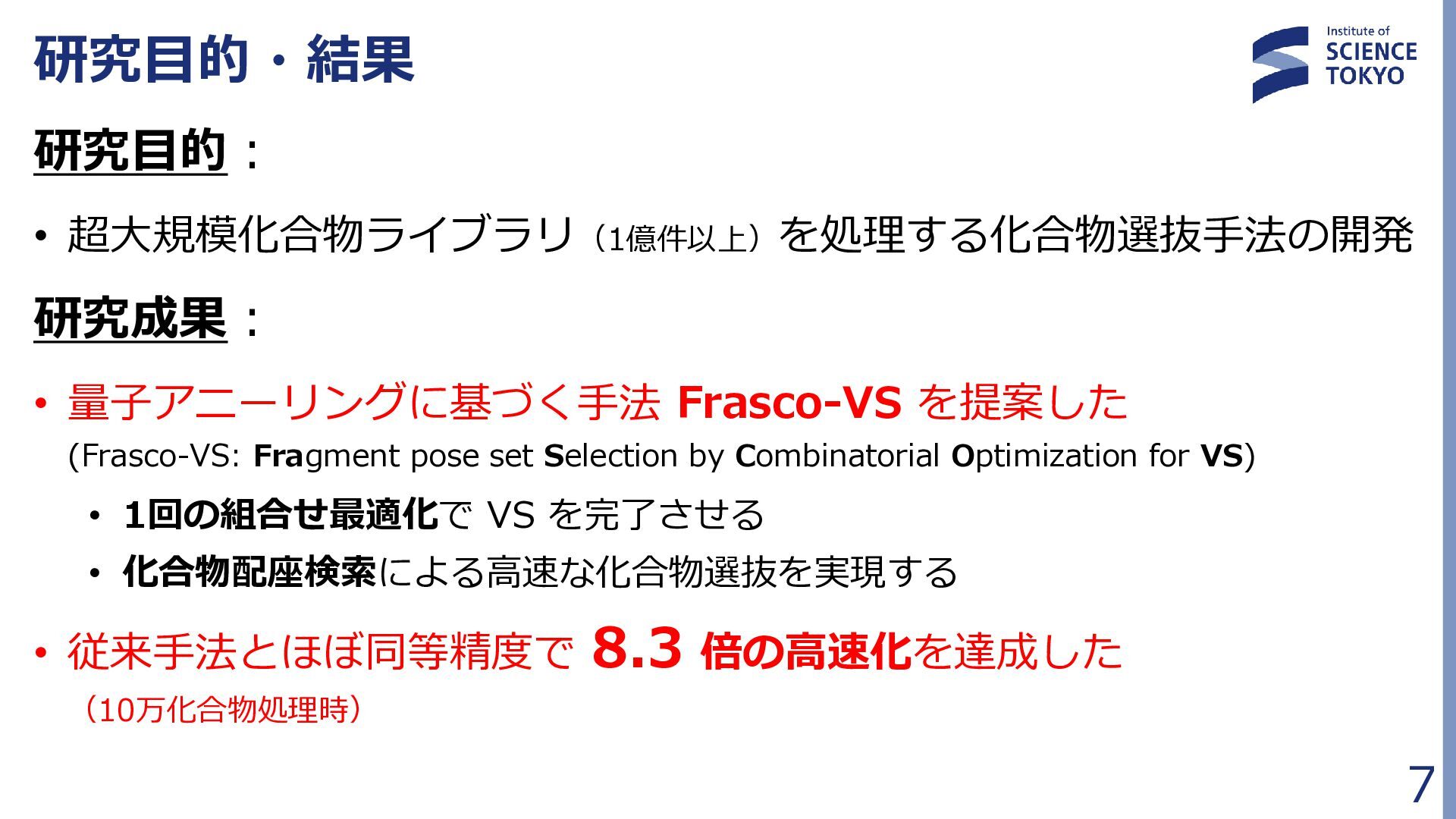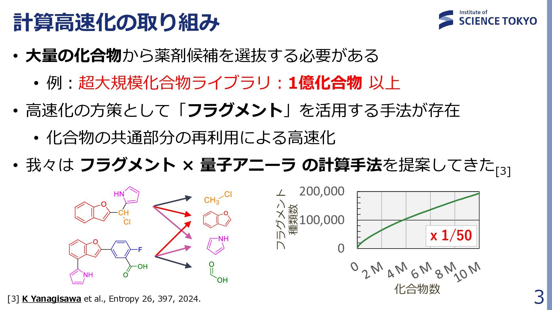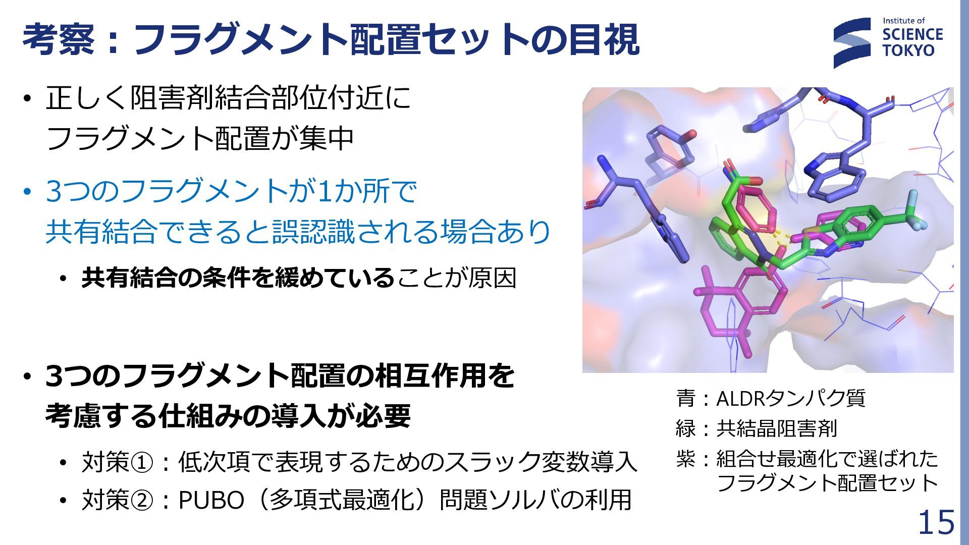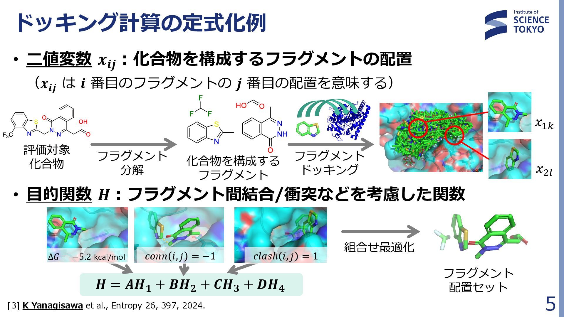 定式化時に問題が大きく簡略化されており、 組合せ最適化の最良解が化合物評価に最良であるとは限らない • 多数の局所解から網羅的に後述の化合物検索を行う Fragment docking QUBO formulation Compound retrieval ・・ ・ ・ ・ ・ Combinatorial Optimization by QA フラグメント配置群 組合せ最適化で得られた 多数のフラグメント配置セット (例:1000件) … 𝐻 = 𝐴 𝑖,𝑗 𝛥𝐺𝑖𝑗 𝐻𝐴𝐶 𝑥𝑖𝑗 + 𝐵 𝑖,𝑗,𝑘,𝑙 𝑏𝑖𝑗,𝑘𝑙 𝑥𝑖𝑗 𝑥𝑘𝑙 + 𝐶 𝑖,𝑗,𝑘,𝑙 𝑐𝑖𝑗,𝑘𝑙 𝑥𝑖𝑗 𝑥𝑘𝑙 + 𝐷 2 𝑖 𝐹 𝑗 𝑥𝑖𝑗 − 0 2 + 𝐸 2 𝑖,𝑗 𝑥𝑖𝑗 − 𝐾 2 組合せ最適化 フラグメント ドッキング QUBO問題 定式化 化合物検索 ・・・ ・・・ 量子アニーラ による 組合せ最適化