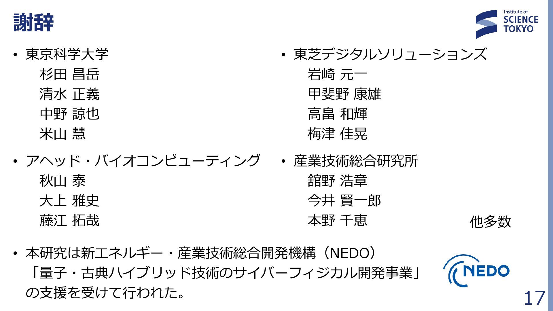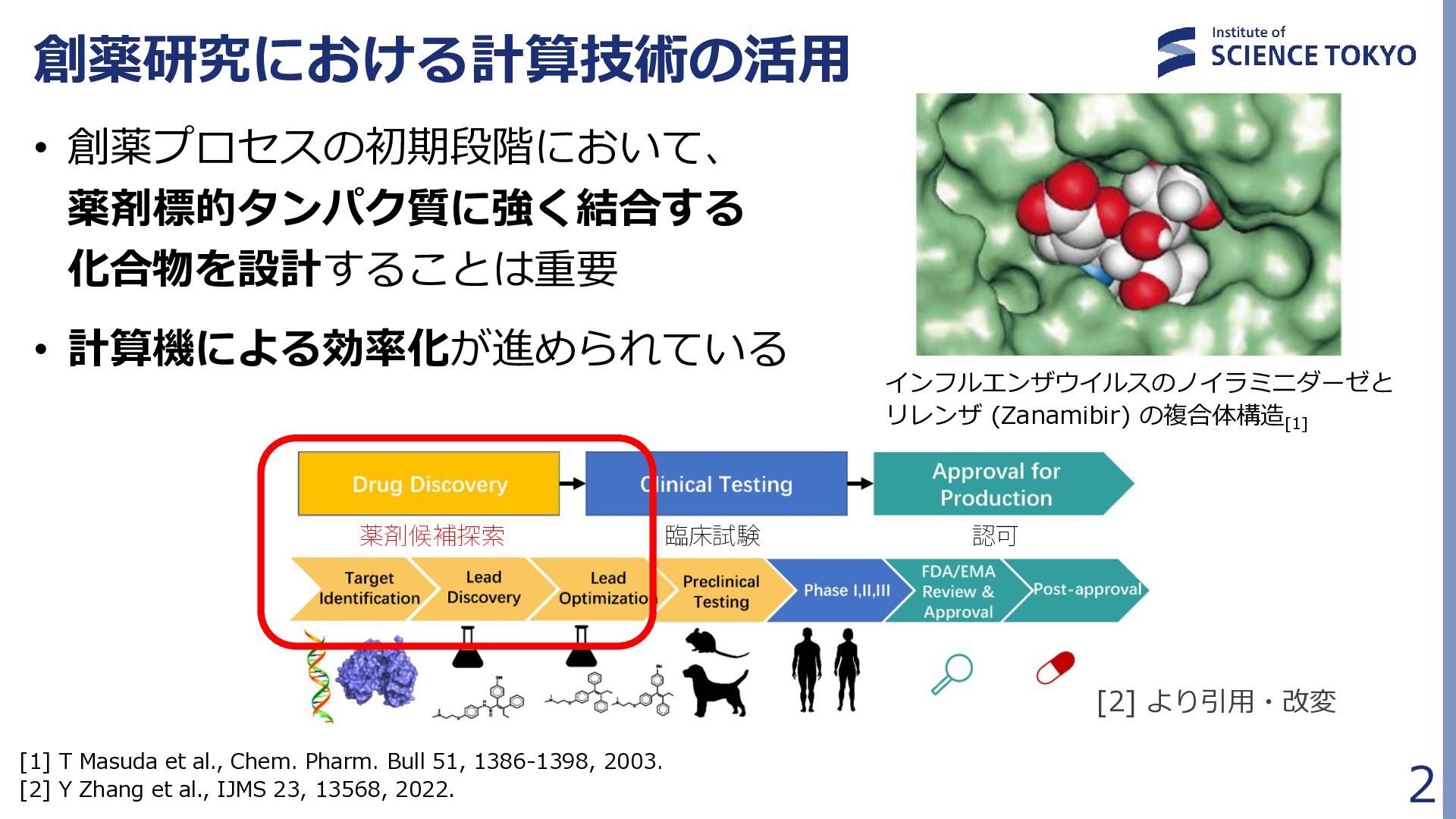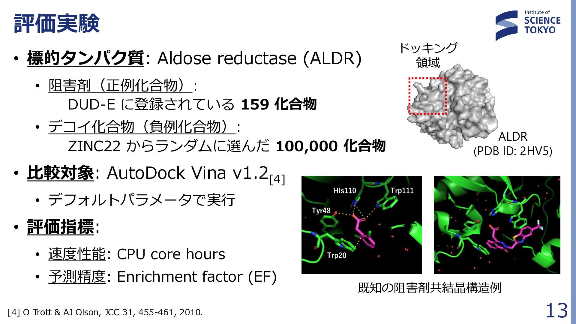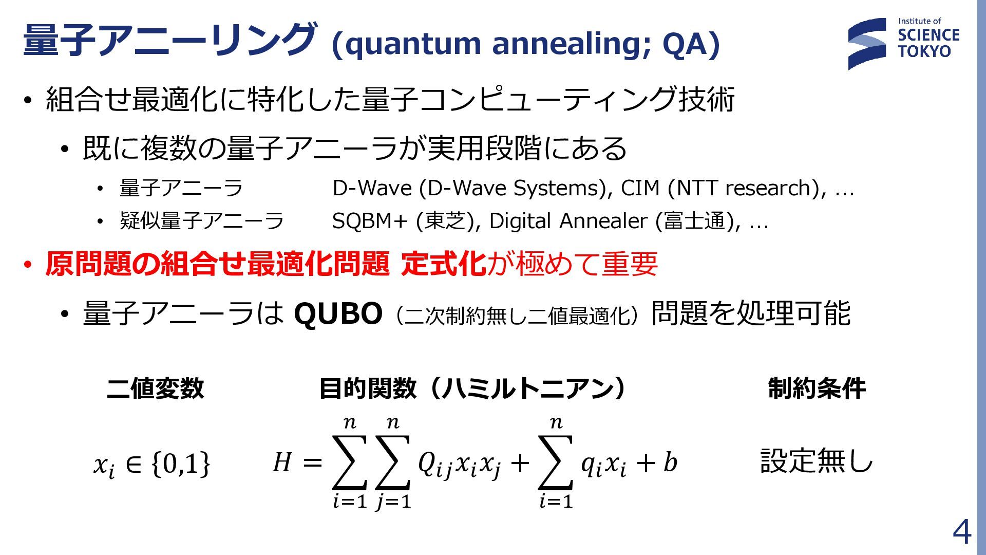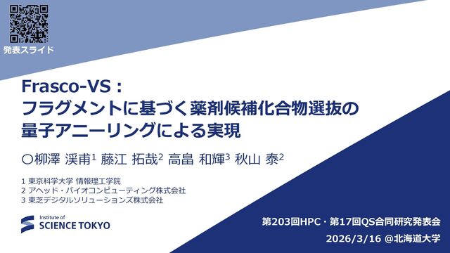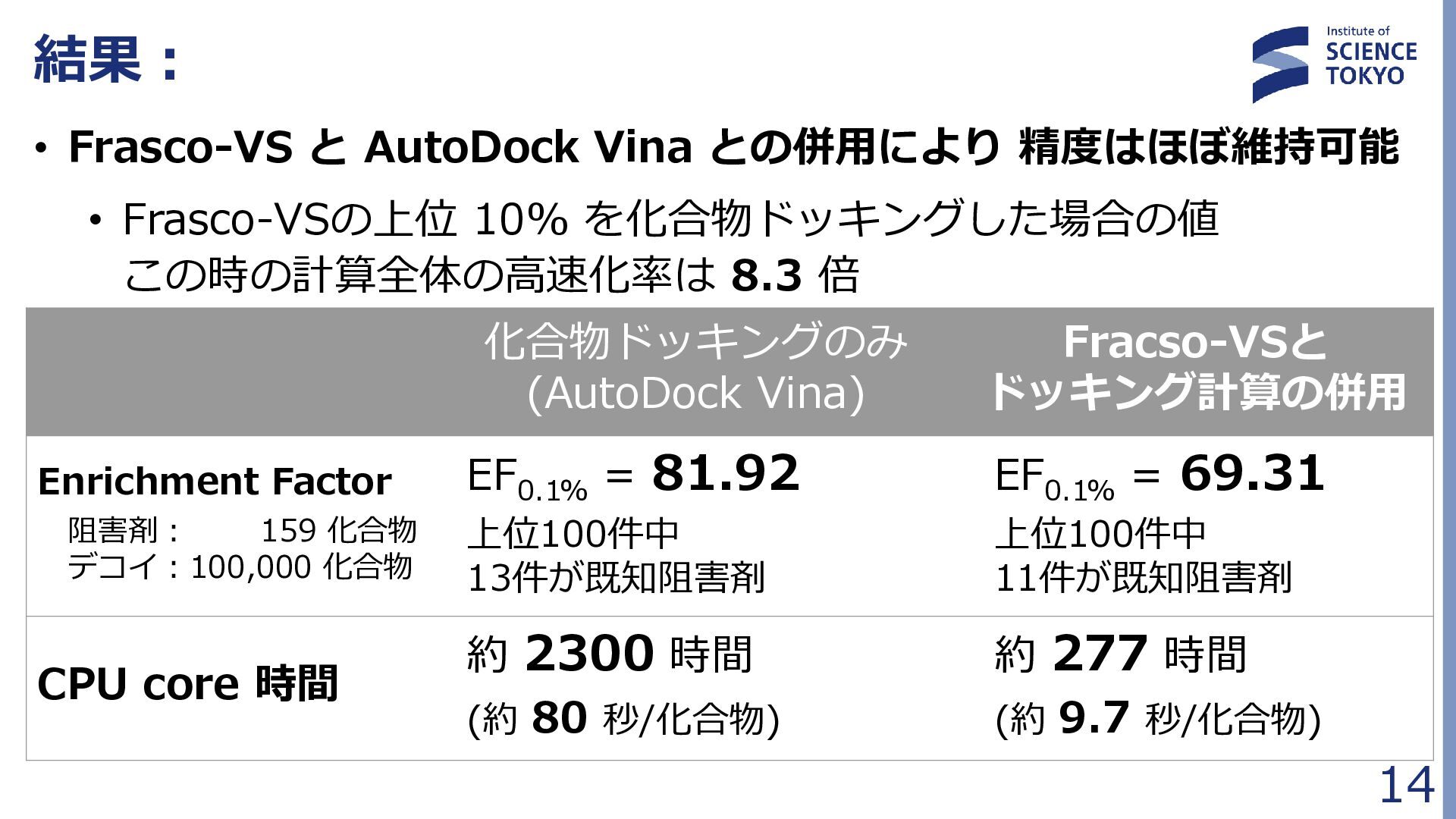 定式化時に問題が大きく簡略化されており、 組合せ最適化の最良解が化合物評価に最良であるとは限らない • 多数の局所解から網羅的に後述の化合物検索を行う Fragment docking QUBO formulation Compound retrieval ・・ ・ ・ ・ ・ Combinatorial Optimization by QA フラグメント配置群 組合せ最適化で得られた 多数のフラグメント配置セット (例:1000件) … 𝐻 = 𝐴 𝑖,𝑗 𝛥𝐺𝑖𝑗 𝐻𝐴𝐶 𝑥𝑖𝑗 + 𝐵 𝑖,𝑗,𝑘,𝑙 𝑏𝑖𝑗,𝑘𝑙 𝑥𝑖𝑗 𝑥𝑘𝑙 + 𝐶 𝑖,𝑗,𝑘,𝑙 𝑐𝑖𝑗,𝑘𝑙 𝑥𝑖𝑗 𝑥𝑘𝑙 + 𝐷 2 𝑖 𝐹 𝑗 𝑥𝑖𝑗 − 0 2 + 𝐸 2 𝑖,𝑗 𝑥𝑖𝑗 − 𝐾 2 組合せ最適化 フラグメント ドッキング QUBO問題 定式化 化合物検索 ・・・ ・・・ 量子アニーラ による 組合せ最適化