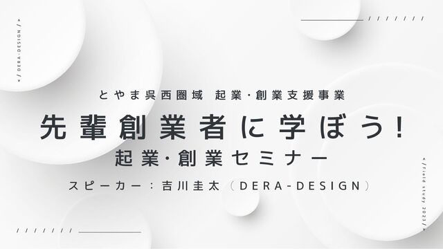 ( D E R A - D E S I G N ) と や ま 呉 西 圏 域 起 業 ɾ創 業 支 援 事 業 先 輩 創 業 者 に 学 ぼ う! 起 業ɾ創 業 セ ミ ナ ー D E R A - D E S I G N F i e l d s t u d y 2 0 2 3