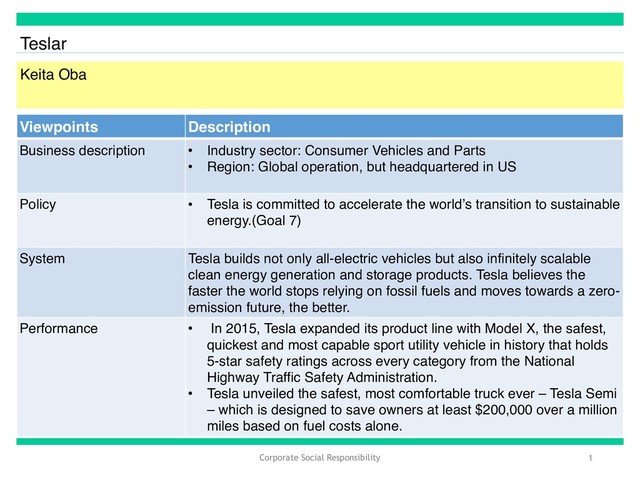 description • Industry sector: Consumer Vehicles and Parts • Region: Global operation, but headquartered in US Policy • Tesla is committed to accelerate the world’s transition to sustainable energy.(Goal 7) System Tesla builds not only all-electric vehicles but also infinitely scalable clean energy generation and storage products. Tesla believes the faster the world stops relying on fossil fuels and moves towards a zero- emission future, the better. Performance • In 2015, Tesla expanded its product line with Model X, the safest, quickest and most capable sport utility vehicle in history that holds 5-star safety ratings across every category from the National Highway Traffic Safety Administration. • Tesla unveiled the safest, most comfortable truck ever – Tesla Semi – which is designed to save owners at least $200,000 over a million miles based on fuel costs alone.