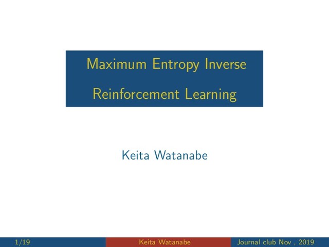 A. Y. (2004). Apprenticeship learning via inverse reinforcement learning. In Proceedings, Twenty-First International Conference on Machine Learning, ICML 2004, pages 1–8. [Boularias et al., 2011] Boularias, A., Kober, J., and Peters, J. (2011). Relative Entropy Inverse Reinforcement Learning. Technical report. [Finn et al., 2016] Finn, C., Levine, S., and Abbeel, P. (2016). Guided Cost Learning: Deep Inverse Optimal Control via Policy Optimization. Technical report. [Ng and Russell, 2000] Ng, A. and Russell, S. (2000). Algorithms for inverse reinforcement learning. Proceedings of the Seventeenth International Conference on Machine Learning, pages 663–670. [Ramachandran and Amir, 2007] Ramachandran, D. and Amir, E. (2007). Bayesian inverse reinforcement learning. In IJCAI International Joint Conference on Artificial Intelligence, pages 2586–2591. 18/19 Keita Watanabe Journal club Nov , 2019