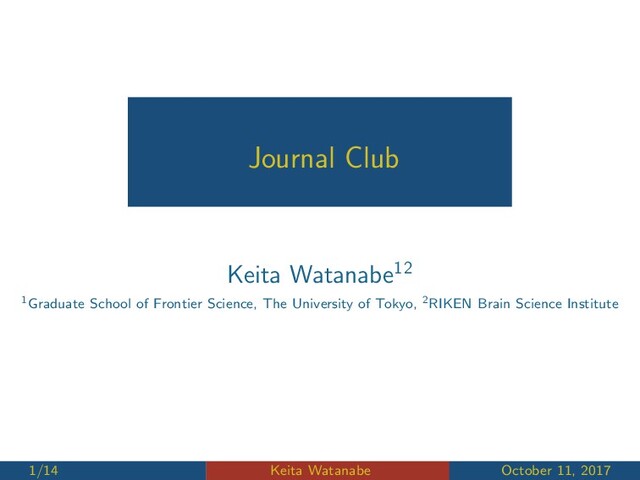 Liang, Y., Ma, T., and Risteski, A. (2015). RAND-WALK: A Latent Variable Model Approach to Word Embeddings. [Firth, 1957] Firth, J. R. (1957). A synopsis of linguistic theory . [Goldberg and Levy, 2014] Goldberg, Y. and Levy, O. (2014). word2vec Explained: deriving Mikolov et al.’s negative-sampling word-embedding method. [Harris, 1954] Harris, Z. S. (1954). Distributional Structure. WORD, 10(2-3):146–162. [Levy and Goldberg, 2014] Levy, O. and Goldberg, Y. (2014). Neural Word Embedding as Implicit Matrix Factorization. pages 2177–2185. [Mikolov et al., 2013] Mikolov, T., Sutskever, I., Chen, K., Corrado, G., and Dean, J. (2013). Distributed Representations of Words and Phrases and their Compositionality. [Rong, 2014] Rong, X. (2014). word2vec Parameter Learning Explained. arXiv.org. 13/14 Keita Watanabe October 11, 2017
