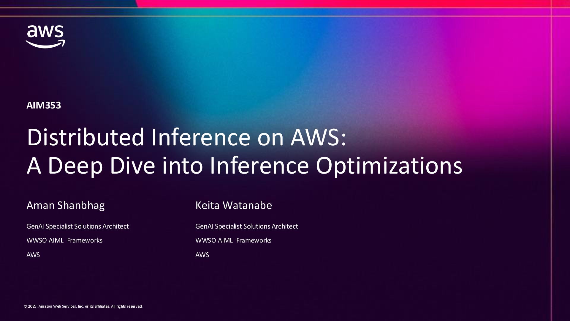 rights reserved. © 2025, Amazon Web Services, Inc. or its affiliates. All rights reserved. AIM353 Aman Shanbhag GenAI Specialist Solutions Architect WWSO AIML Frameworks AWS Keita Watanabe GenAI Specialist Solutions Architect WWSO AIML Frameworks AWS Distributed Inference on AWS: A Deep Dive into Inference Optimizations