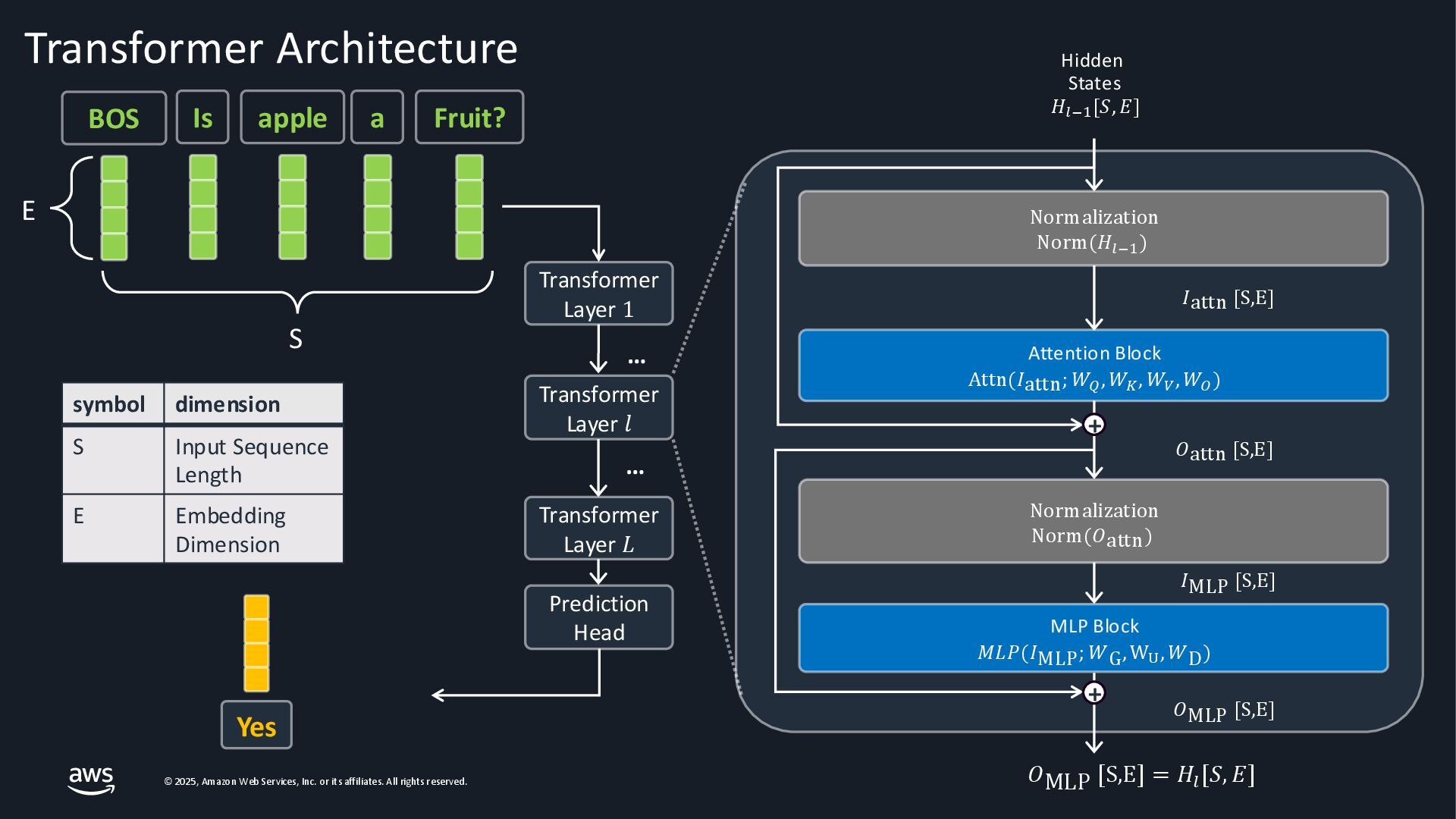 rights reserved. Transformer Architecture Transformer Layer 1 Transformer Layer 𝑙 Transformer Layer 𝐿 Prediction Head … … Normalization Norm(𝐻𝑙−1 ) Hidden States 𝐻𝑙−1 [𝑆, 𝐸] Attention Block Attn(𝐼attn; 𝑊𝑄 , 𝑊𝐾 , 𝑊𝑉 , 𝑊𝑂 ) Normalization Norm(𝑂attn) MLP Block 𝑀𝐿𝑃(𝐼MLP; 𝑊G, WU , 𝑊D) 𝐼attn [S,E] 𝑂MLP [S,E] = 𝐻𝑙 [𝑆, 𝐸] 𝑂attn [S,E] 𝐼MLP [S,E] 𝑂MLP [S,E] + + + symbol dimension S Input Sequence Length E Embedding Dimension Is apple a Fruit? S E Yes BOS