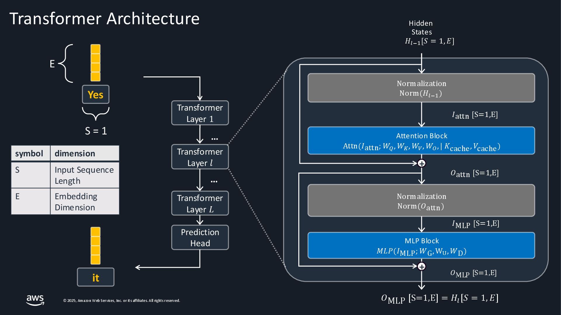 rights reserved. Transformer Architecture Transformer Layer 1 Transformer Layer 𝑙 Transformer Layer 𝐿 Prediction Head … … Normalization Norm(𝐻𝑙−1 ) Hidden States 𝐻𝑙−1 [𝑆 = 1, 𝐸] Attention Block Attn(𝐼attn; 𝑊𝑄 , 𝑊𝐾 , 𝑊𝑉 , 𝑊𝑂 , | 𝐾cache, 𝑉cache) Normalization Norm(𝑂attn) MLP Block 𝑀𝐿𝑃(𝐼MLP; 𝑊G, WU , 𝑊D) 𝐼attn [S=1,E] 𝑂MLP [S=1,E] = 𝐻𝑙 [𝑆 = 1, 𝐸] 𝑂attn [S=1,E] 𝐼MLP [S=1,E] 𝑂MLP [S=1,E] + + + symbol dimension S Input Sequence Length E Embedding Dimension S = 1 E Yes it