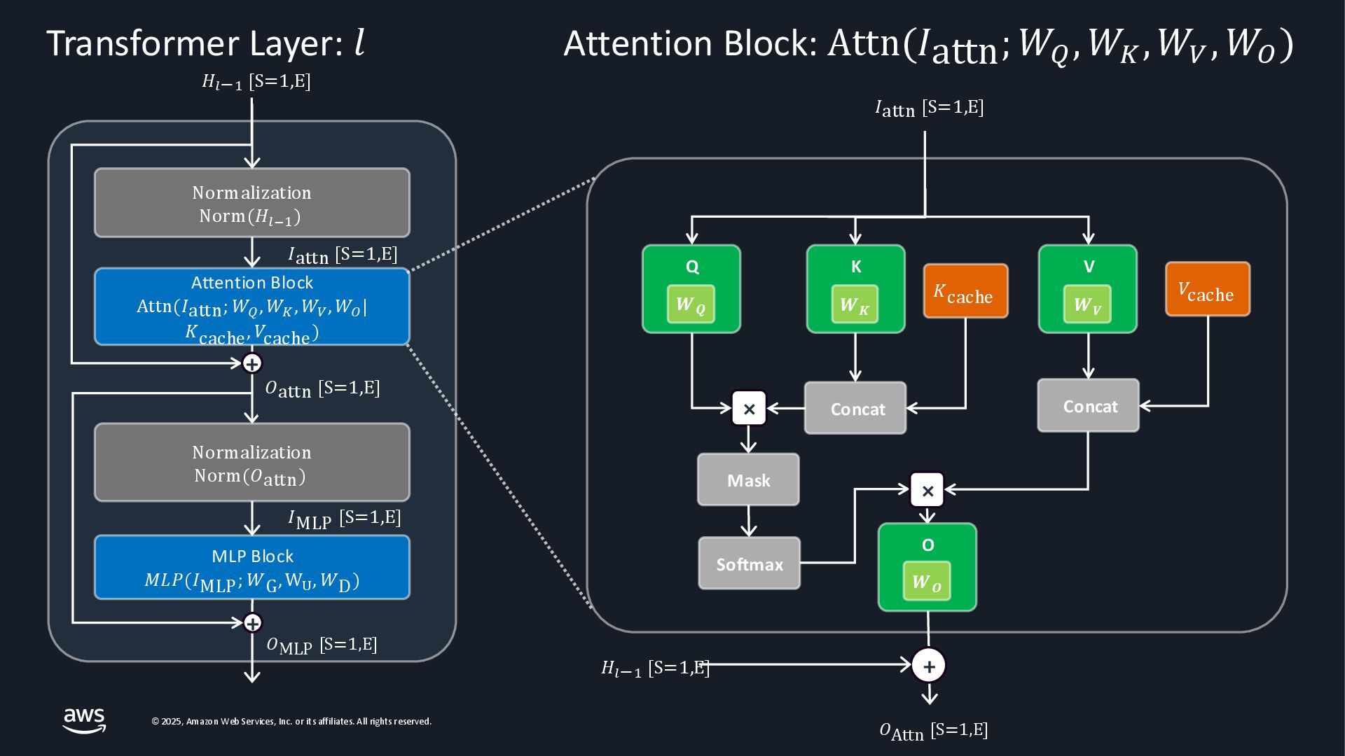 rights reserved. Transformer Layer: 𝑙 Attention Block: Attn(𝐼attn; 𝑊𝑄 , 𝑊𝐾 , 𝑊𝑉 , 𝑊𝑂 ) 𝐼attn [S=1,E] 𝑂Attn [S=1,E] Q 𝑾𝑸 K 𝑾𝑲 O 𝑾𝑶 V 𝑾𝑽 × Mask × Normalization Norm(𝐻𝑙−1 ) Attention Block Attn(𝐼attn; 𝑊𝑄 , 𝑊𝐾 , 𝑊𝑉 , 𝑊𝑂 | 𝐾cache, 𝑉cache) Normalization Norm(𝑂attn) MLP Block 𝑀𝐿𝑃(𝐼MLP; 𝑊G, WU , 𝑊D) 𝐼attn [S=1,E] 𝑂attn [S=1,E] 𝐼MLP [S=1,E] 𝑂MLP [S=1,E] + + u + + 𝐻𝑙−1 [S=1,E] 𝐻𝑙−1 [S=1,E] 𝐾cache 𝑉cache Concat Concat Softmax