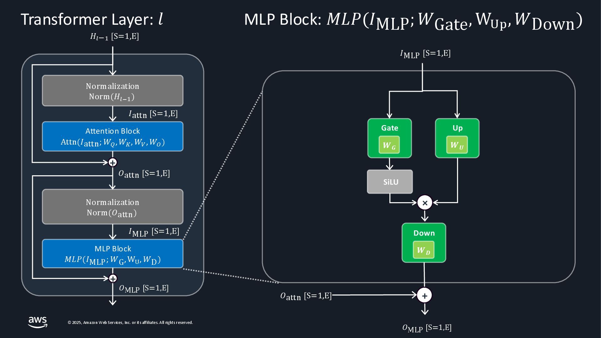 rights reserved. Transformer Layer: 𝑙 MLP Block: 𝑀𝐿𝑃(𝐼MLP; 𝑊Gate, WUp , 𝑊Down) Normalization Norm(𝐻𝑙−1 ) Attention Block Attn(𝐼attn; 𝑊𝑄 , 𝑊𝐾 , 𝑊𝑉 , 𝑊𝑂 ) Normalization Norm(𝑂attn) MLP Block 𝑀𝐿𝑃(𝐼MLP; 𝑊G, WU , 𝑊D) 𝐼attn [S=1,E] 𝑂attn [S=1,E] 𝐼MLP [S=1,E] 𝑂MLP [S=1,E] + + u + SiLU Gate 𝑾𝑮 Up 𝑾𝑼 × 𝐼MLP [S=1,E] Down 𝑾𝑫 𝐻𝑙−1 [S=1,E] + 𝑂attn [S=1,E] 𝑂MLP [S=1,E]