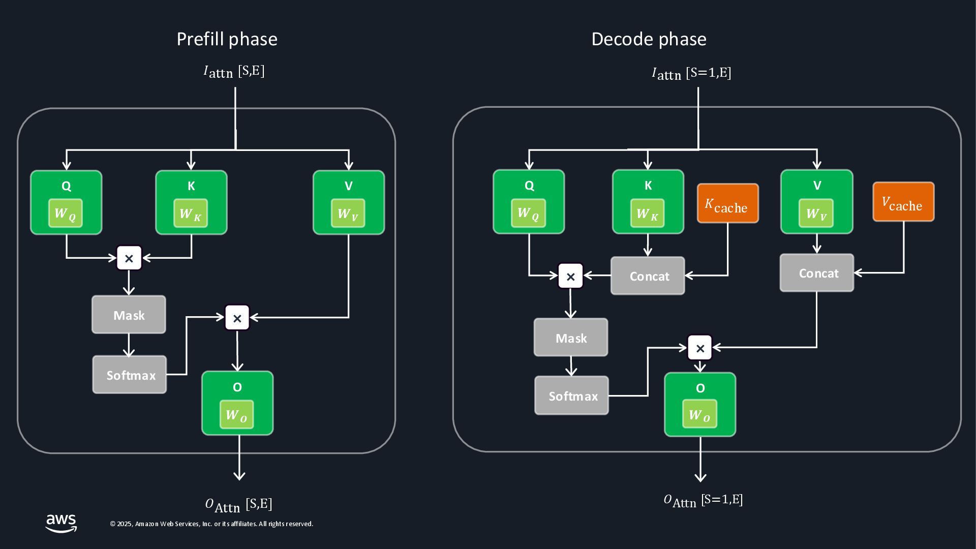 rights reserved. Q 𝑾𝑸 K 𝑾𝑲 O 𝑾𝑶 V 𝑾𝑽 × Softmax × 𝐾cache 𝑉cache Concat Concat Q 𝑾𝑸 K 𝑾𝑲 O 𝑾𝑶 V 𝑾𝑽 × Mask × Prefill phase Decode phase 𝐼attn [S=1,E] 𝑂Attn [S=1,E] 𝐼attn [S,E] 𝑂Attn [S,E] Softmax Mask