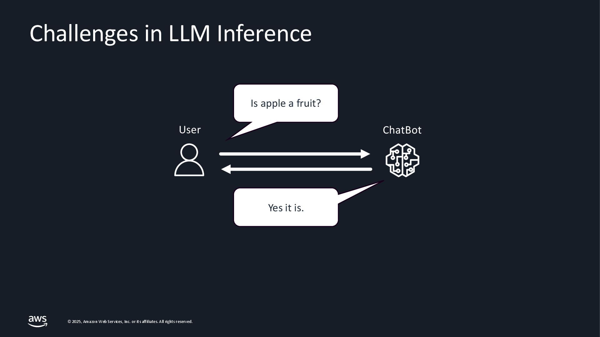 rights reserved. Challenges in LLM Inference Is apple a fruit? Yes it is. User ChatBot