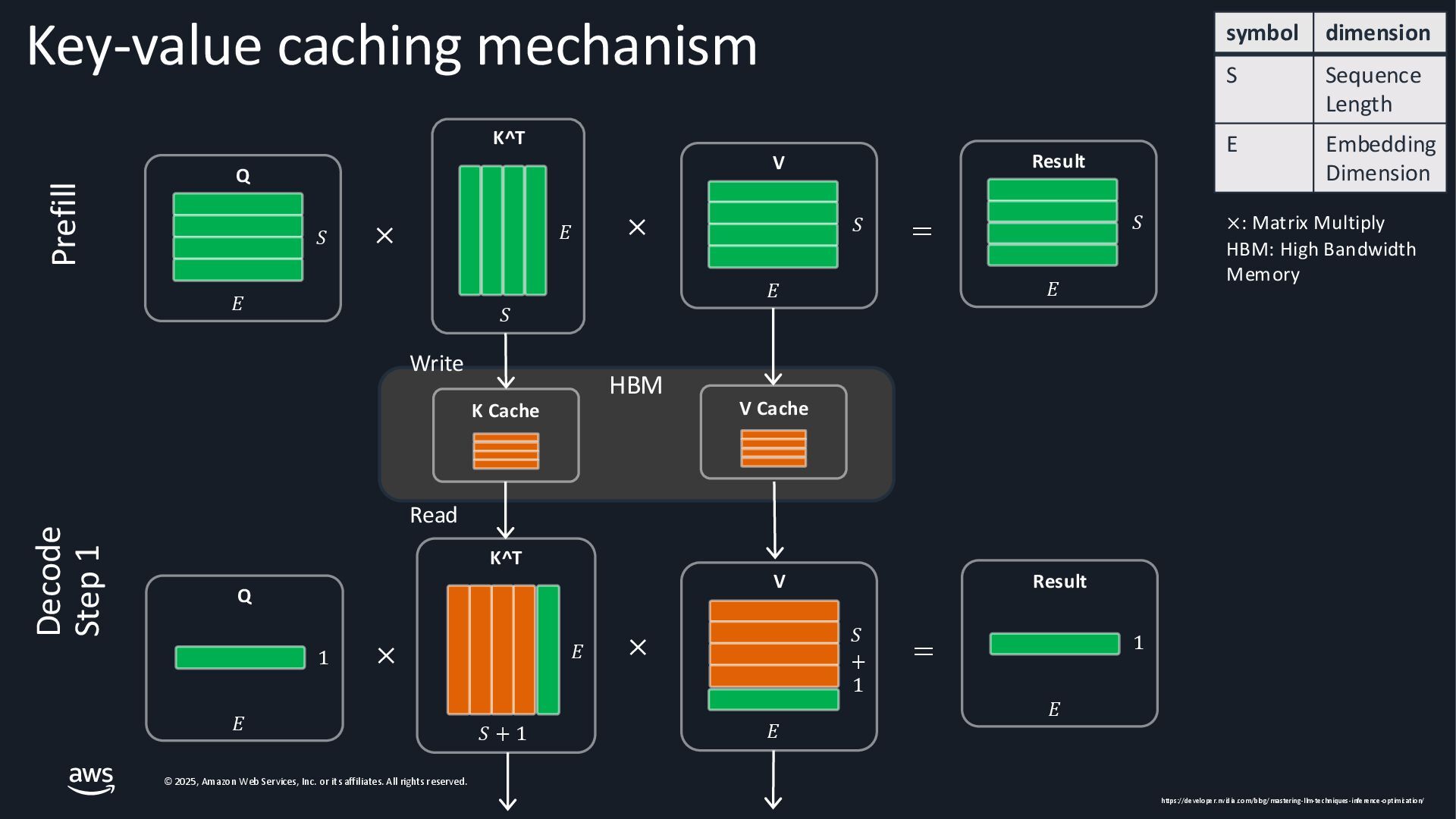 rights reserved. HBM Key-value caching mechanism symbol dimension S Sequence Length E Embedding Dimension https://developer.nvidia.com/blog/mastering-llm-techniques-inference-optimization/ Q 𝑆 𝐸 × ×: Matrix Multiply HBM: High Bandwidth Memory K^T 𝐸 𝑆 × V 𝑆 𝐸 Prefill Decode Step 1 K Cache Result 𝑆 𝐸 = V Cache Q 1 𝐸 × K^T 𝐸 𝑆 + 1 × V 𝑆 + 1 𝐸 Result 1 𝐸 = Write Read