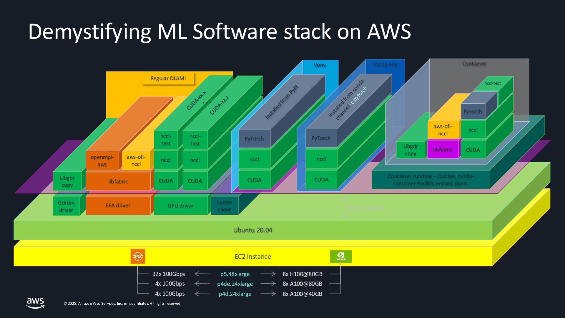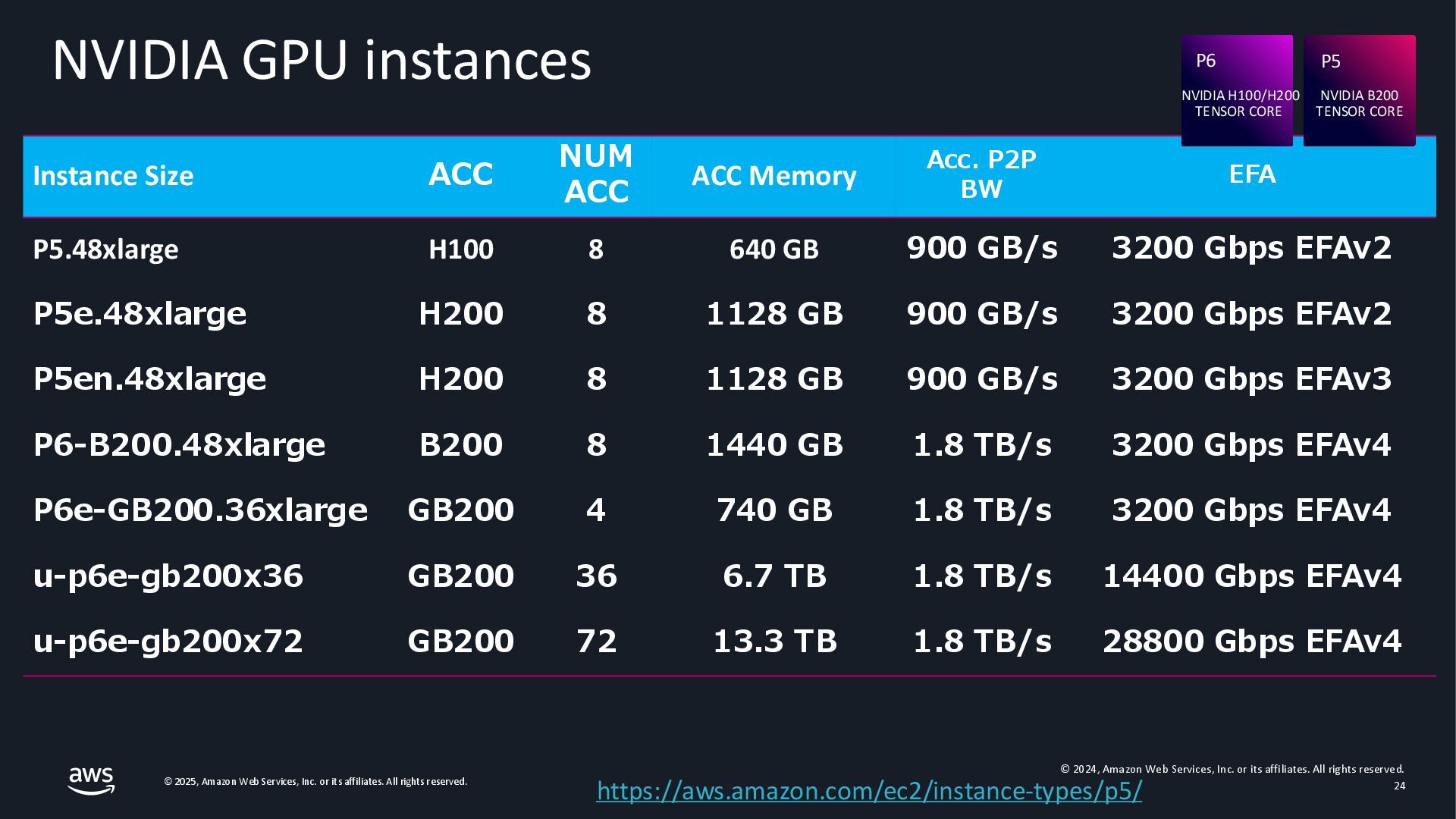rights reserved. NVIDIA GPU instances 24 © 2024, Amazon Web Services, Inc. or its affiliates. All rights reserved. Instance Size ACC NUM ACC ACC Memory Acc. P2P BW EFA P5.48xlarge H100 8 640 GB 900 GB/s 3200 Gbps EFAv2 P5e.48xlarge H200 8 1128 GB 900 GB/s 3200 Gbps EFAv2 P5en.48xlarge H200 8 1128 GB 900 GB/s 3200 Gbps EFAv3 P6-B200.48xlarge B200 8 1440 GB 1.8 TB/s 3200 Gbps EFAv4 P6e-GB200.36xlarge GB200 4 740 GB 1.8 TB/s 3200 Gbps EFAv4 u-p6e-gb200x36 GB200 36 6.7 TB 1.8 TB/s 14400 Gbps EFAv4 u-p6e-gb200x72 GB200 72 13.3 TB 1.8 TB/s 28800 Gbps EFAv4 https://aws.amazon.com/ec2/instance-types/p5/ P6 NVIDIA H100/H200 TENSOR CORE P5 NVIDIA B200 TENSOR CORE