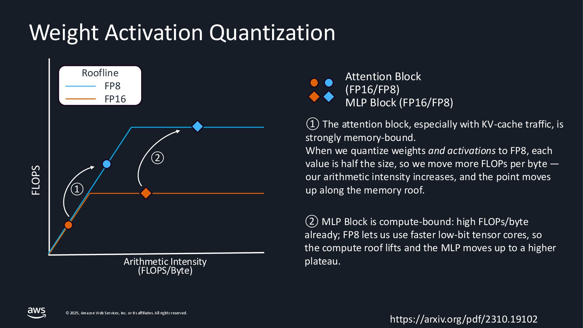 rights reserved. Weight Activation Quantization FLOPS Arithmetic Intensity (FLOPS/Byte) Attention Block (FP16/FP8) MLP Block (FP16/FP8) Roofline FP8 FP16 ① ② ② MLP Block is compute-bound: high FLOPs/byte already; FP8 lets us use faster low-bit tensor cores, so the compute roof lifts and the MLP moves up to a higher plateau. ① The attention block, especially with KV-cache traffic, is strongly memory-bound. When we quantize weights and activations to FP8, each value is half the size, so we move more FLOPs per byte — our arithmetic intensity increases, and the point moves up along the memory roof. https://arxiv.org/pdf/2310.19102