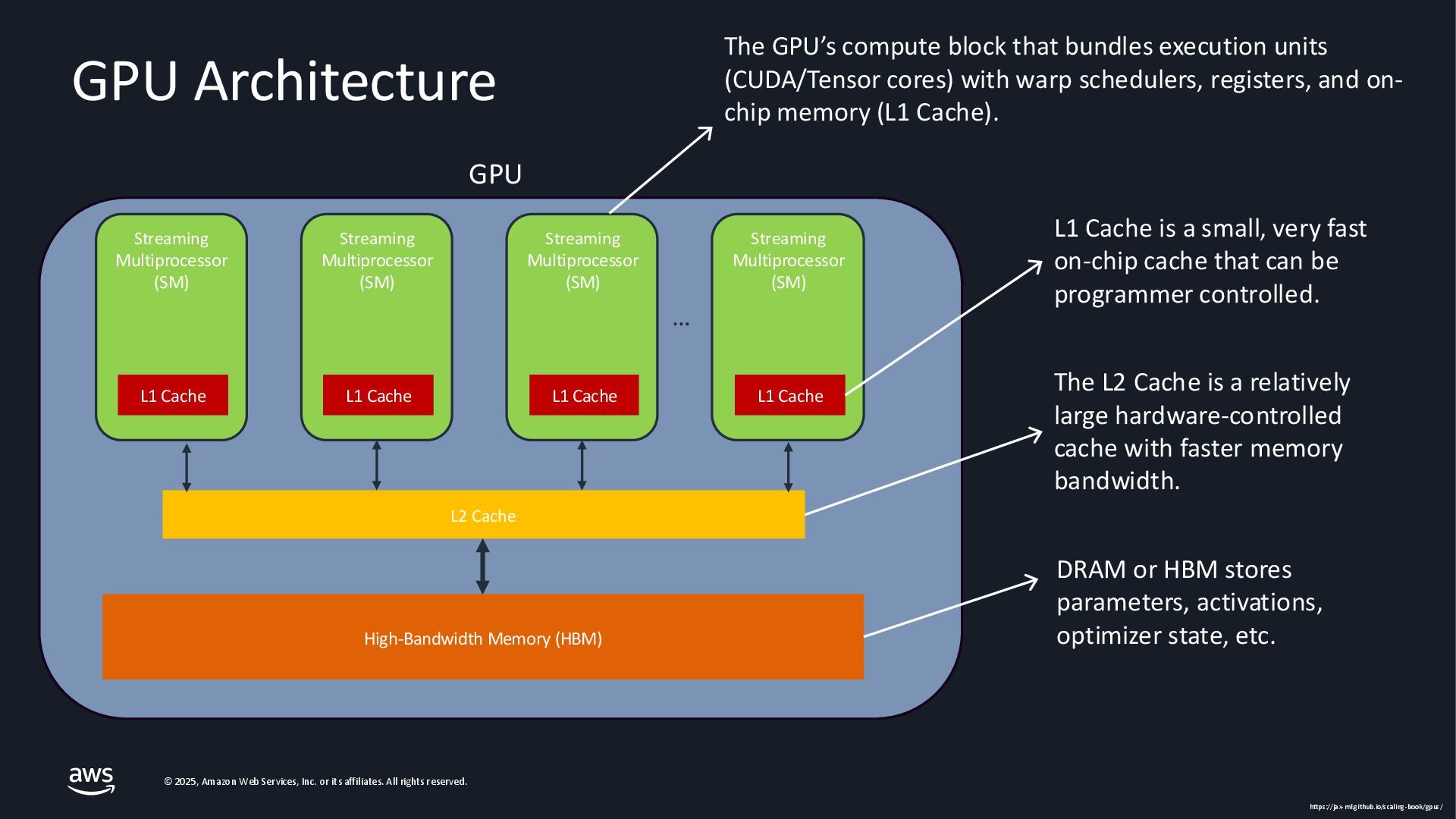 rights reserved. GPU Architecture Streaming Multiprocessor (SM) L1 Cache Streaming Multiprocessor (SM) L1 Cache Streaming Multiprocessor (SM) L1 Cache Streaming Multiprocessor (SM) L1 Cache L2 Cache High-Bandwidth Memory (HBM) GPU … L1 Cache is a small, very fast on-chip cache that can be programmer controlled. The L2 Cache is a relatively large hardware-controlled cache with faster memory bandwidth. DRAM or HBM stores parameters, activations, optimizer state, etc. The GPU’s compute block that bundles execution units (CUDA/Tensor cores) with warp schedulers, registers, and on- chip memory (L1 Cache). https://jax-ml.github.io/scaling-book/gpus/