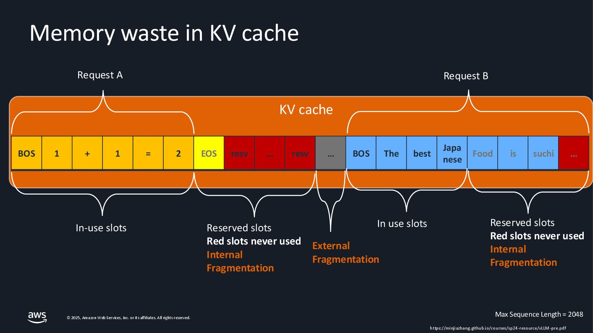 rights reserved. Memory waste in KV cache https://minjiazhang.github.io/courses/sp24-resource/vLLM-pre.pdf KV cache BOS 1 + 1 = 2 EOS resv … resv … BOS The best Japa nese Food is suchi … Max Sequence Length = 2048 In-use slots Request A Request B In use slots Reserved slots Red slots never used Internal Fragmentation Reserved slots Red slots never used Internal Fragmentation External Fragmentation
