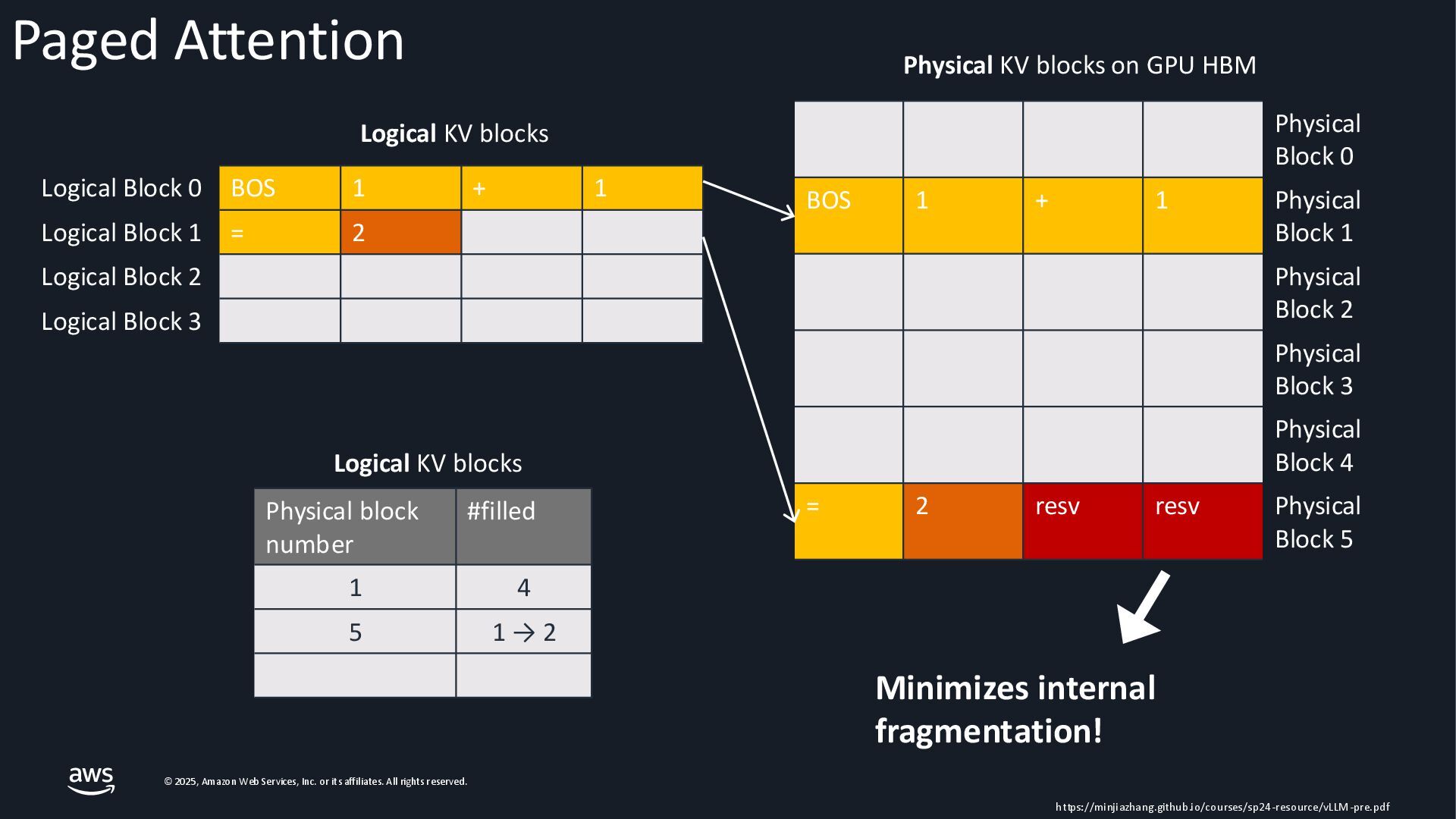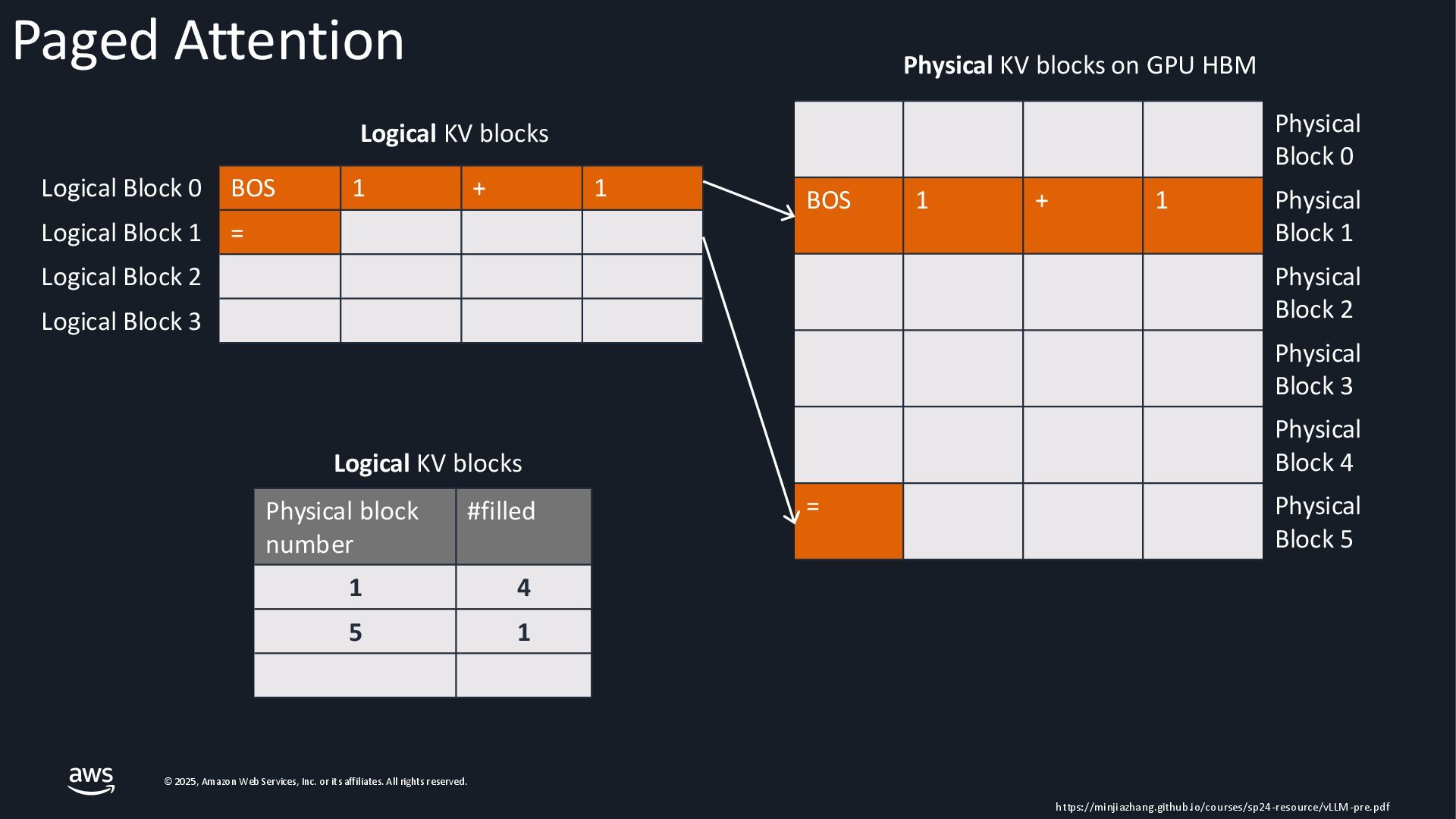 rights reserved. Paged Attention https://minjiazhang.github.io/courses/sp24-resource/vLLM-pre.pdf Logical Block 0 BOS 1 + 1 Logical Block 1 = Logical Block 2 Logical Block 3 Physical Block 0 BOS 1 + 1 Physical Block 1 Physical Block 2 Physical Block 3 Physical Block 4 = Physical Block 5 Logical KV blocks Physical KV blocks on GPU HBM Physical block number #filled 1 4 5 1 Logical KV blocks