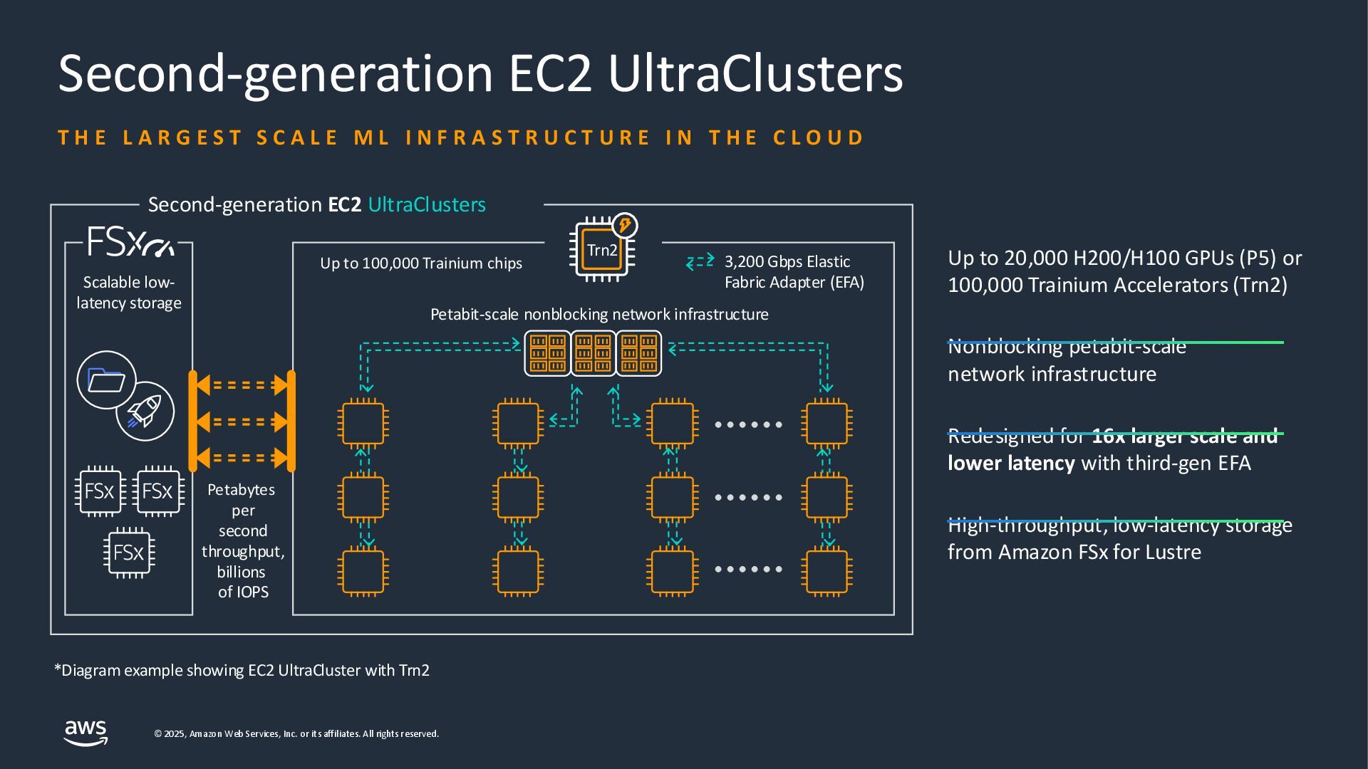 rights reserved. Up to 20,000 H200/H100 GPUs (P5) or 100,000 Trainium Accelerators (Trn2) Nonblocking petabit-scale network infrastructure Redesigned for 16x larger scale and lower latency with third-gen EFA High-throughput, low-latency storage from Amazon FSx for Lustre T H E L A R G E S T S C A L E M L I N F R A S T R U C T U R E I N T H E C L O U D Second-generation EC2 UltraClusters *Diagram example showing EC2 UltraCluster with Trn2 Up to 100,000 Trainium chips Petabytes per second throughput, billions of IOPS 3,200 Gbps Elastic Fabric Adapter (EFA) Petabit-scale nonblocking network infrastructure Scalable low- latency storage Second-generation EC2 UltraClusters Trn2