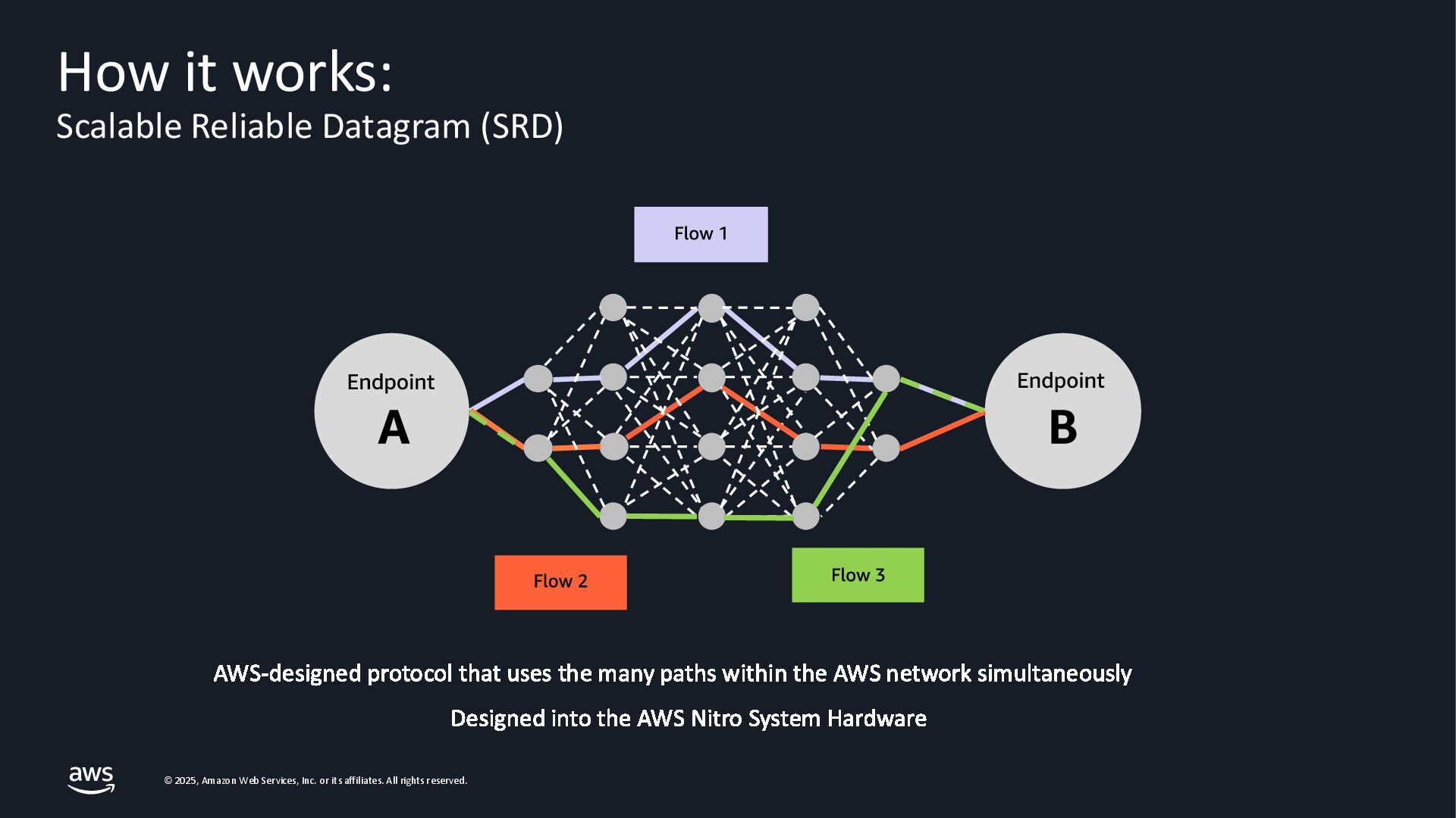 rights reserved. How it works: Scalable Reliable Datagram (SRD) AWS-designed protocol that uses the many paths within the AWS network simultaneously Designed into the AWS Nitro System Hardware
