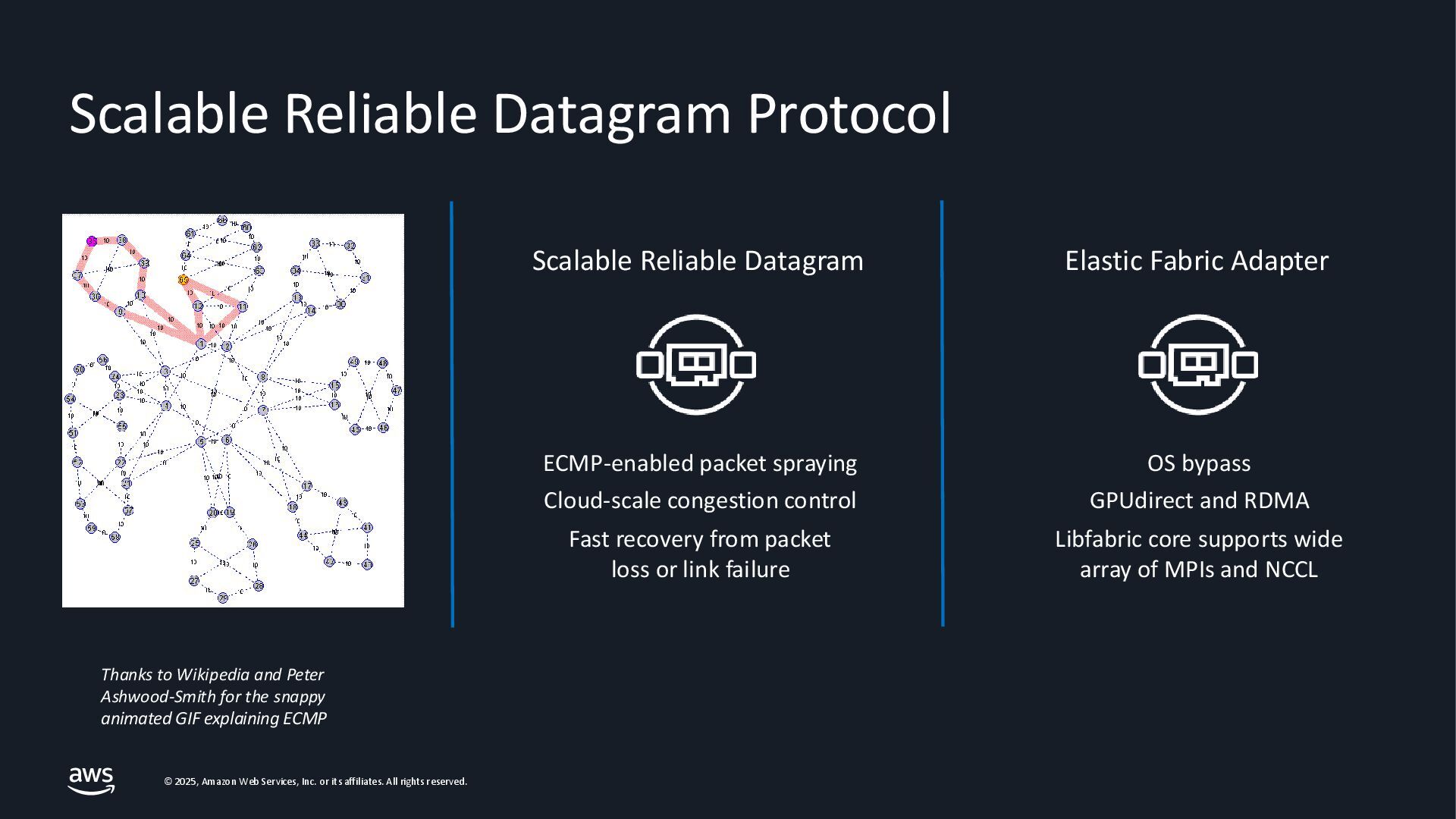 rights reserved. Scalable Reliable Datagram Protocol Thanks to Wikipedia and Peter Ashwood-Smith for the snappy animated GIF explaining ECMP Elastic Fabric Adapter OS bypass GPUdirect and RDMA Libfabric core supports wide array of MPIs and NCCL Scalable Reliable Datagram ECMP-enabled packet spraying Cloud-scale congestion control Fast recovery from packet loss or link failure