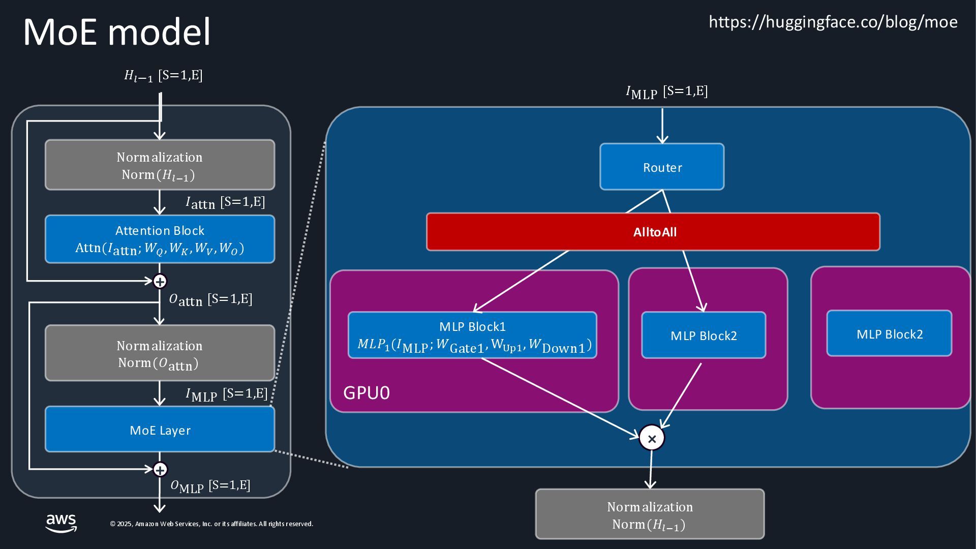 rights reserved. MoE model MLP Block1 𝑀𝐿𝑃1 (𝐼MLP; 𝑊Gate1, WUp1 , 𝑊Down1) MLP Block2 MLP Block2 Normalization Norm(𝐻𝑙−1 ) Attention Block Attn(𝐼attn; 𝑊𝑄 , 𝑊𝐾 , 𝑊𝑉 , 𝑊𝑂 ) Normalization Norm(𝑂attn) MoE Layer 𝐼attn [S=1,E] 𝑂attn [S=1,E] 𝐼MLP [S=1,E] 𝑂MLP [S=1,E] + + u + 𝐻𝑙−1 [S=1,E] Router 𝐼MLP [S=1,E] https://huggingface.co/blog/moe Normalization Norm(𝐻𝑙−1 ) × GPU0 AlltoAll