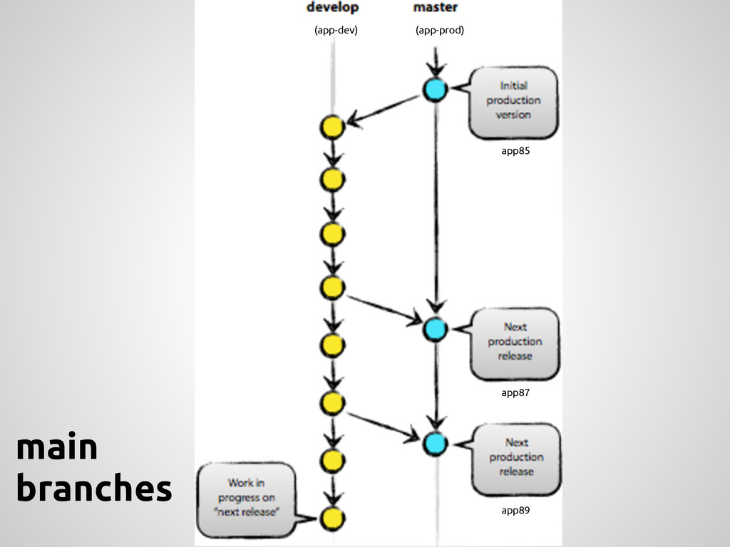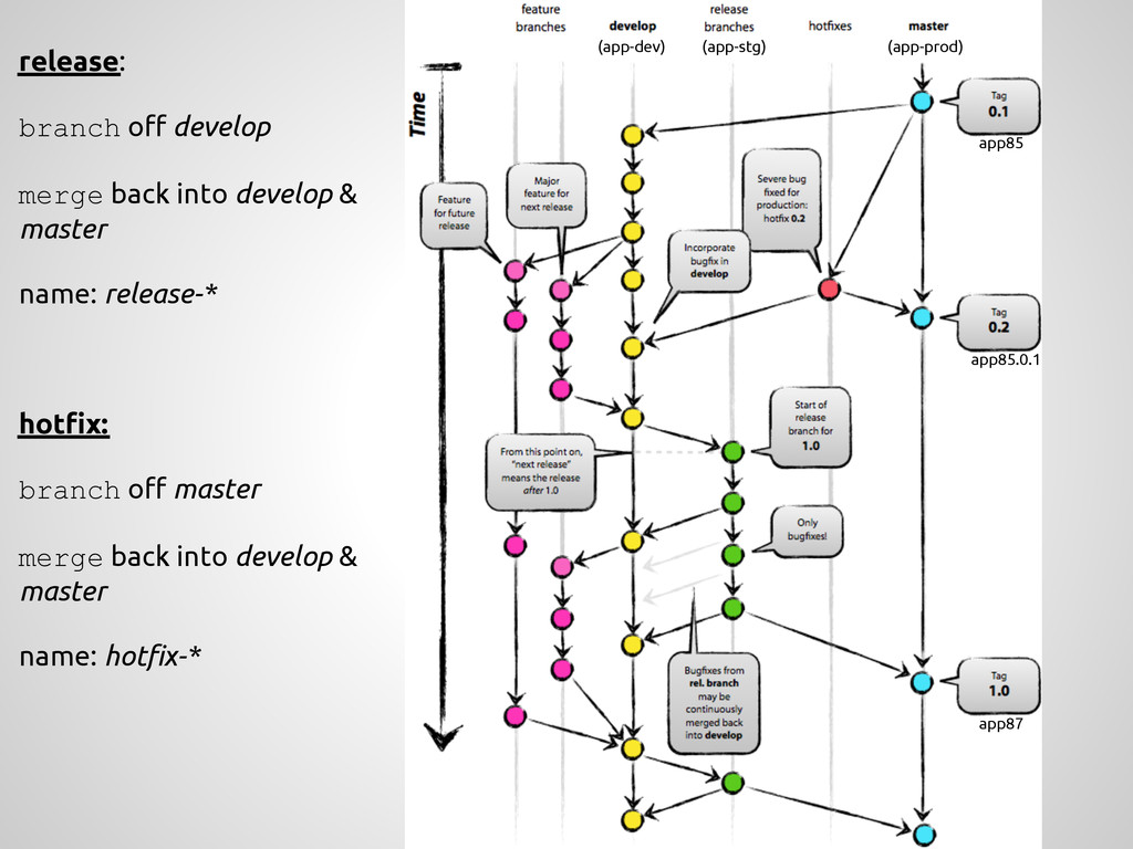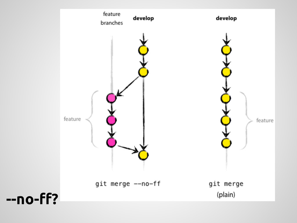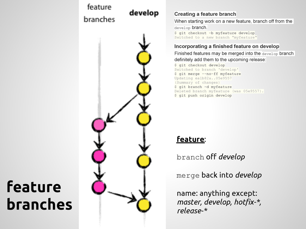a new feature, branch off from the develop branch. $ git checkout -b myfeature develop Switched to a new branch "myfeature" Incorporating a finished feature on develop Finished features may be merged into the develop branch definitely add them to the upcoming release: $ git checkout develop Switched to branch 'develop' $ git merge --no-ff myfeature Updating ea1b82a..05e9557 (Summary of changes) $ git branch -d myfeature Deleted branch myfeature (was 05e9557). $ git push origin develop feature: branch off develop merge back into develop name: anything except: master, develop, hotfix-*, release-*