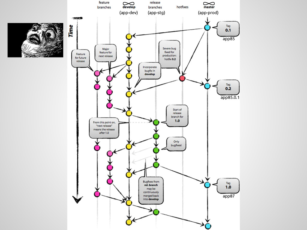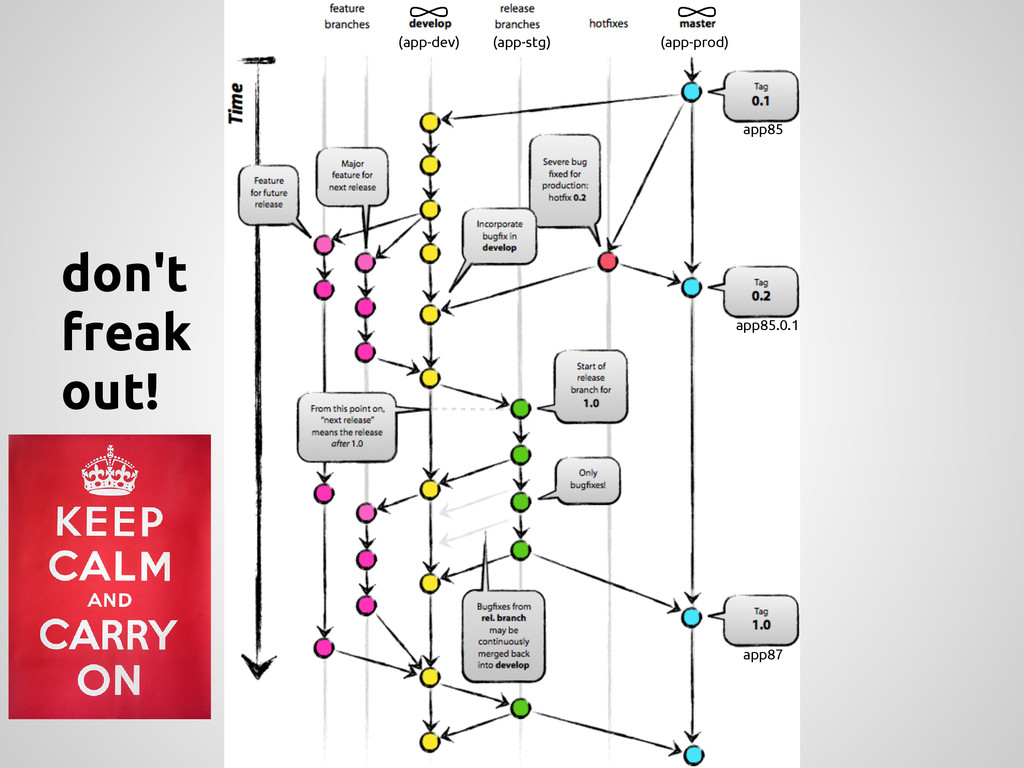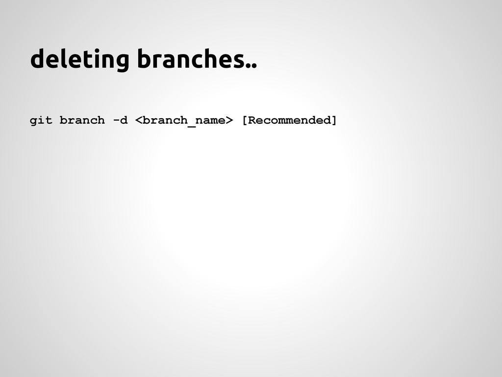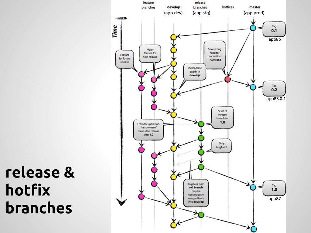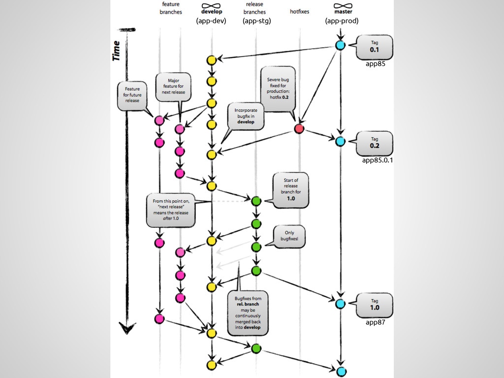 a new feature, branch off from the develop branch. $ git checkout -b myfeature develop Switched to a new branch "myfeature" Incorporating a finished feature on develop Finished features may be merged into the develop branch definitely add them to the upcoming release: $ git checkout develop Switched to branch 'develop' $ git merge --no-ff myfeature Updating ea1b82a..05e9557 (Summary of changes) $ git branch -d myfeature Deleted branch myfeature (was 05e9557). $ git push origin develop feature: branch off develop merge back into develop name: anything except: master, develop, hotfix-*, release-*