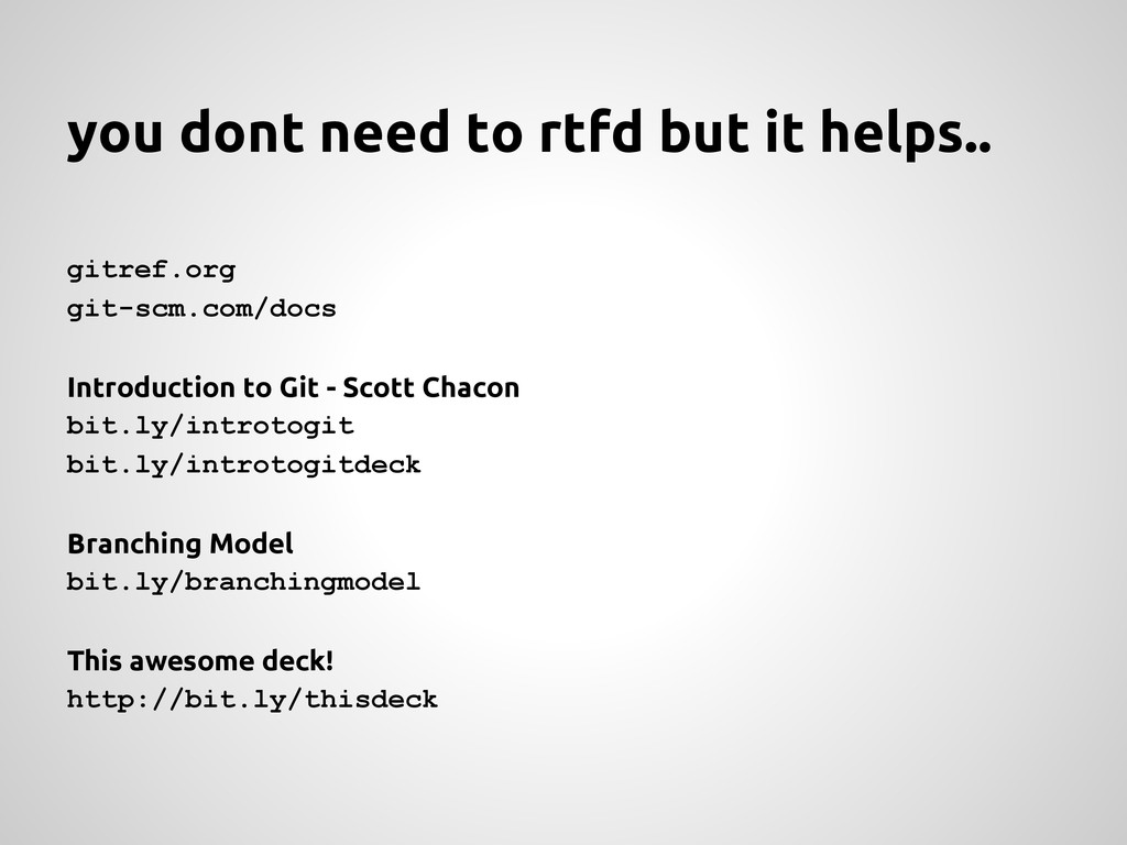 Introduction to Git - Scott Chacon bit.ly/introtogit bit.ly/introtogitdeck Branching Model bit.ly/branchingmodel This awesome deck! http://bit.ly/thisdeck