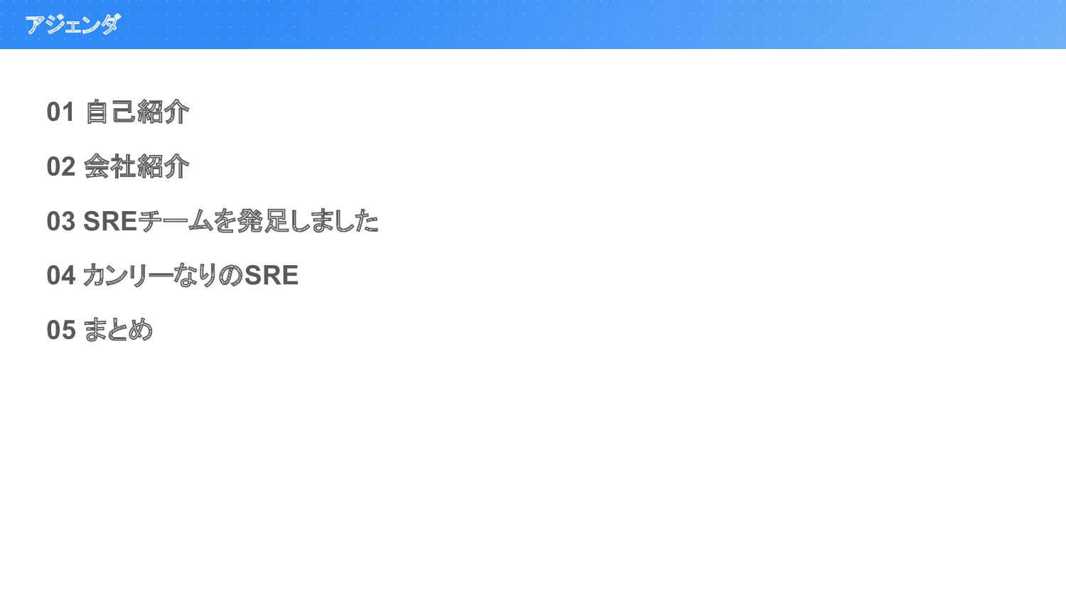 アジェンダ 01 自己紹介 02 会社紹介 03 SREチームを発足しました 04 カンリーなりのSRE 05
