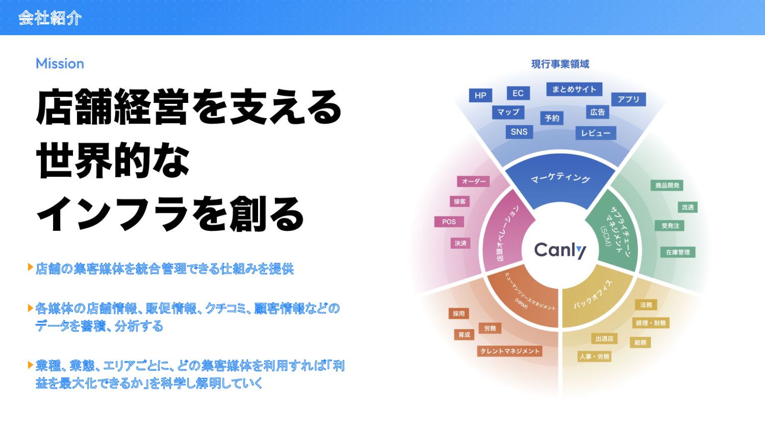 会社紹介 店舗の集客媒体を統合管理できる仕組みを提供 各媒体の店舗情報、販促情報、クチコミ、顧客情報などの データを蓄積、分析する 業種、業態、エリアごとに、どの集客媒体を利用すれば「利 益を最大化できるか」を科学し解明していく