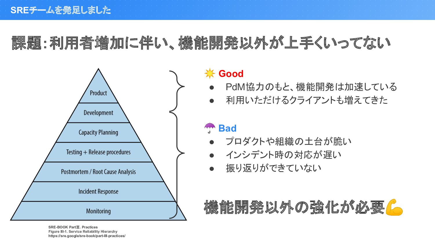 プロダクトや組織の土台が脆い • インシデント時の対応が遅い • 振り返りができていない 課題:利用者増加に伴い、機能開発以外が上手くいってない 機能開発以外の強化が必要💪 SRE-BOOK PartⅢ. Practices Figure III-1. Service Reliability Hierarchy https://sre.google/sre-book/part-III-practices/