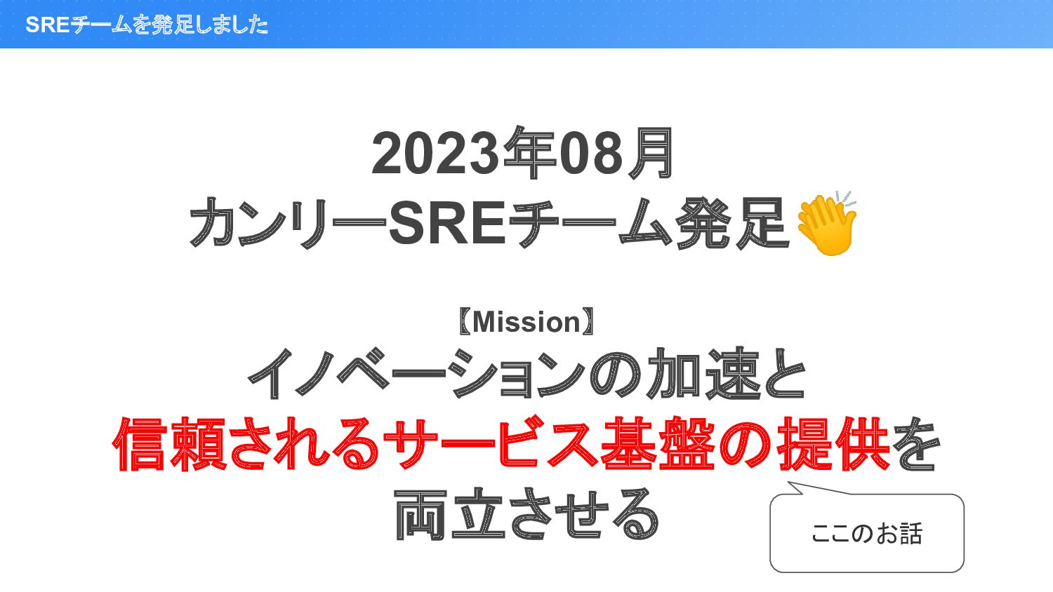 SREチームを発足しました 2023年08月 カンリーSREチーム発足👏 【Mission】 イノベーションの加速と 信頼されるサービス基盤の提供を 両立させる ここのお話