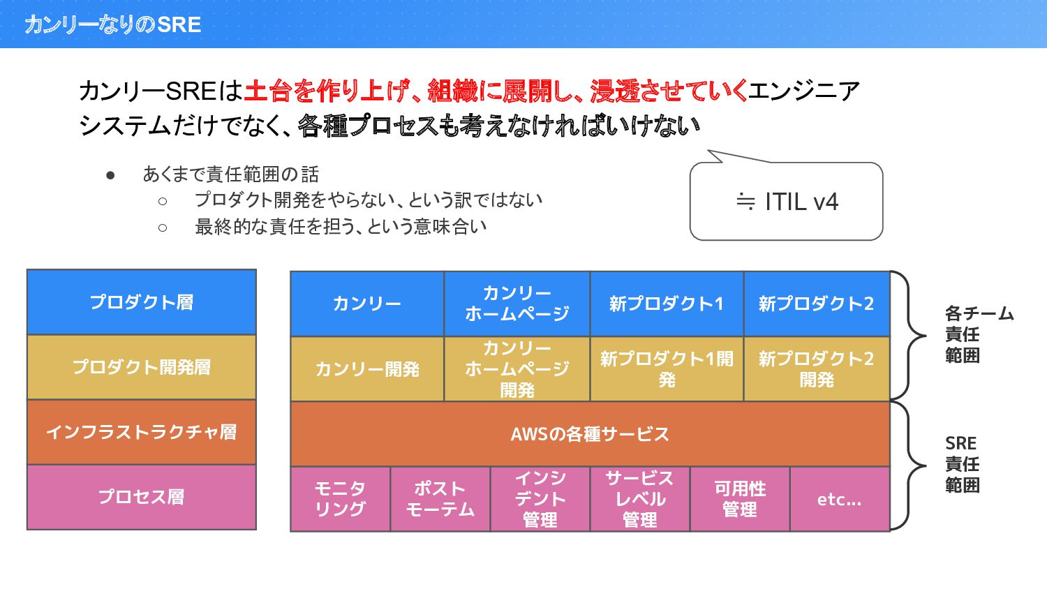 管理 サービス レベル 管理 可用性 管理 etc... インフラストラクチャ層 AWSの各種サービス プロダクト開発層 プロダクト層 カンリー開発 カンリー ホームページ 開発 新プロダクト1開 発 新プロダクト2 開発 カンリー カンリー ホームページ 新プロダクト2 新プロダクト1 SRE 責任 範囲 各チーム 責任 範囲 • あくまで責任範囲の話 ◦ プロダクト開発をやらない、という訳ではない ◦ 最終的な責任を担う、という意味合い ≒ ITIL v4
