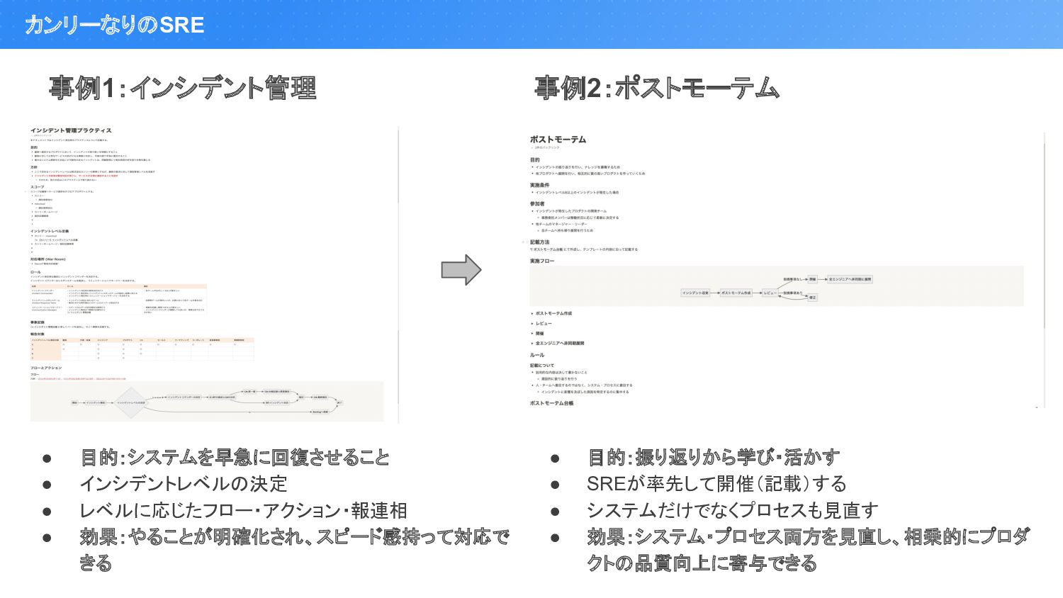 きる 事例2:ポストモーテム • 目的:振り返りから学び・活かす • SREが率先して開催(記載)する • システムだけでなくプロセスも見直す • 効果:システム・プロセス両方を見直し、相乗的にプロダ クトの品質向上に寄与できる