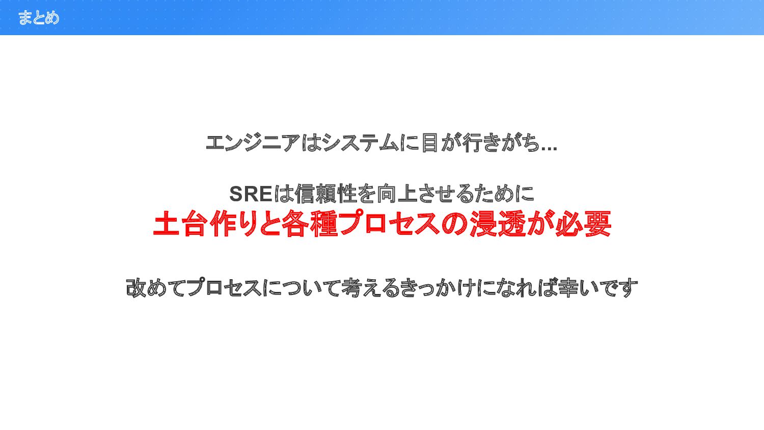 まとめ エンジニアはシステムに目が行きがち... SREは信頼性を向上させるために 土台作りと各種プロセスの浸透が必要 改めてプロセスについて考えるきっかけになれば幸いです