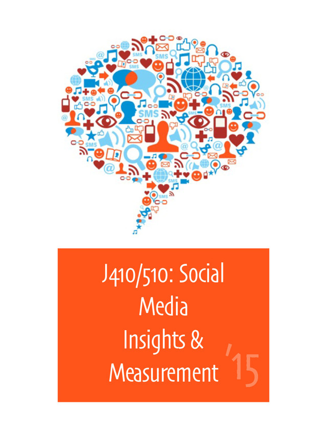 and strategists must understand data. They must understand how to gather and interpret data - clicks, shares, likes and comments. The best strategists are also able to take the data gathered to draw insights and read those insights in order to make actionable recommendations to their organization. You should check your aversion to math or a fear of spreadsheets at the door. What’s a pivot table you ask? We’ll find out. How else will you know what character length in a post gets the highest engagement rate? Online if someone clicks, there’s a way to measure activity. But does that mean we have to measure everything? Facebook insight exports are dozens and dozens and dozens of columns of numbers. How do you know what’s important? This course will go beyond the superficial and ask students to think like real strategists: gathering and interpreting data, drawing insights and making actionable recommendations. Learning outcomes: • Understand concepts and apply theories in the use and presentation of images and information in a social media context; • Think critically, creatively and independently; • Write correctly and clearly in forms and styles appropriate for the communications professions, audiences and purposes they serve; • Critically evaluate their own work and that of others for accuracy and fairness, clarity, appropriate style and grammatical correctness; • Apply basic numerical and statistical concepts to evaluate, plan and implement strategic social media tactics. • Apply tools and technologies appropriate for digital and social media strategists and managers. Kelli Matthews | [email protected] Tweet: @kmatthews | Call/Text: 541.579.5888 Meet: meetme.so/kellimatthews | #J410smi Thursday 4 pm - 6:50 pm | 302 Allen