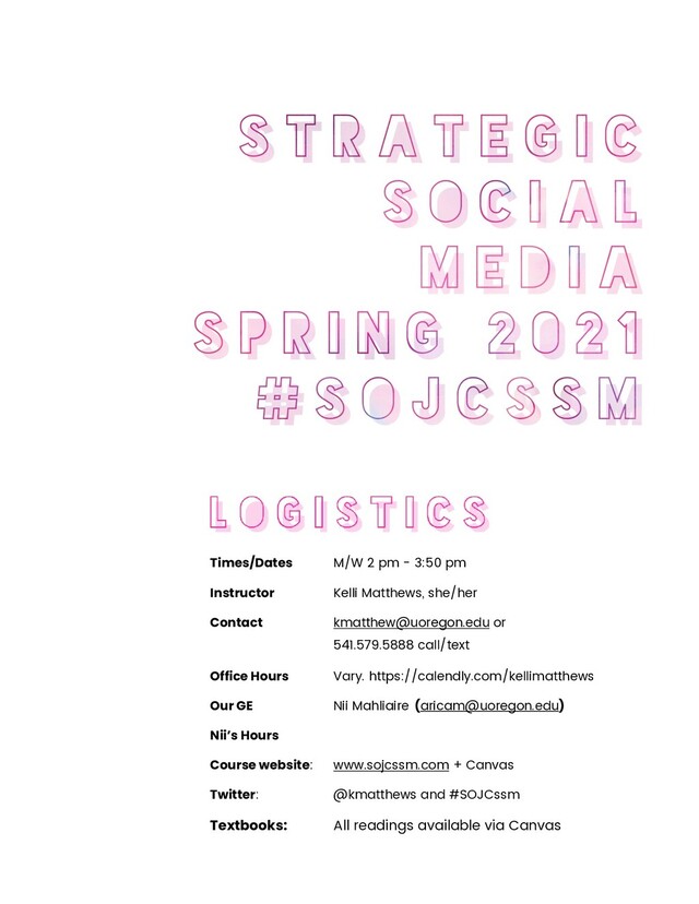 in class on time, every time the class meets. If you are unable to attend class, you’re expected to inform me via email before class begins. Every student is expected to accept responsibility for getting assignments, understanding precisely what is expected, and getting the work done to a high professional standard on or before specified deadlines. Disabilities Students with documented disabilities who may need accommodations, who have any emergency medical information the instructor should know of, or who need special arrangements in the event of evacuation, should make an appointment with the instructor as early as possible, no later than the end of the first week of the term. Inclusiveness Open inquiry, freedom of expression, and respect for difference are fundamental to a comprehensive and dynamic education. I am committed to upholding these ideals by encouraging the exploration, engagement, and expression of divergent perspectives and diverse identities. Harassment Title IX makes it clear that violence and harassment based on sex and gender are Civil Rights offenses subject to the same kinds of accountability and the same kinds of support applied to offenses against other protected categories such as race, national origin, etc. If you or someone you know has been harassed or assaulted, you can find the appropriate resources here https://safe.uoregon.edu/ Conflict Resolution Several options, both informal and formal, are available to you to resolve conflicts. First, follow the chain of command: (1) the instructor, (2) Associate Dean Patricia Curtin, (3) Senior Associate Dean Leslie Steeves, (4) Dean Juan- Carlos Molleda. Outside the School, you can contact the UO Bias Response Team 346-1139, Conflict Resolution Services 346-0617, or Affirmative Action and Equal Opportunity office 346-3123 Computer Use Academic integrity I take academic dishonesty very seriously. In this industry, your integrity is your professional capital. It’s the most powerful thing you bring to the table and you have to protect it at all costs. Academic Integrity, based on the values of honesty, trust, fairness, respect, and responsibility, is a fundamental principle of scholarship at the UO and SOJC. UO’s Academic Misconduct Policy prohibits: plagiarism (using another person’s writing or copying any work without proper citation), fabrication, unauthorized collaboration during a test or on an assignment, or substitution for another student to take an exam, course or test. If you are to benefit from this class and be properly evaluated for your contributions, it is important for you to be familiar with and follow UO’s Academic Misconduct policy. Students are encouraged to review UO’s Academic Misconduct Policy on-line at http:// policies.uoregon.edu/vol-3-administration- student-affairs/ch-1-conduct/student-conduct- code Work that violates these values is incompatible with the goals of this class and will not be tolerated. Students who are found responsible for a violation of the Academic Misconduct Policy will be sanctioned. The first offense will result in a failing grade for the assignment and a deduction from the professionalism grade. Subsequent violations will result in failing the course. Academic dishonesty includes attendance- related activities such as checking in for someone else or allowing someone to check you in. Resources: Did I plagiarize? http:// thevisualcommunicationguy.com/2014/09/16/ did-i-plagiarize-the-types-and-severity-of- plagiarism-violations/ Plagiarism.org http://www.plagiarism.org/ (excellent resources including how to prevent plagiarism and a way to check your paper before you submit).
