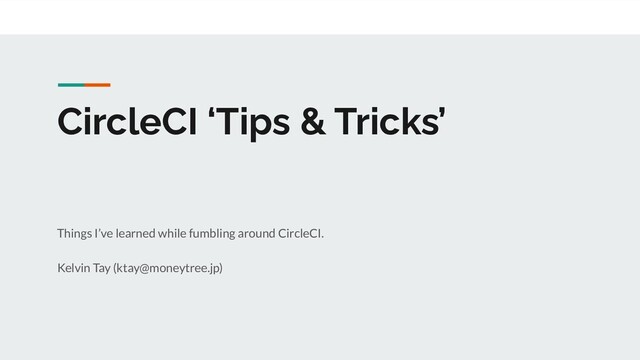 your config 3. inspect tools available 4. keep calm while waiting on CI build 5. keep things dry like biscuits a. Parameters b. Matrix builds c. Orbs 6. take the road less travelled a. Scheduled Workflows b. Tag Workflows 7. do Serverless with CircleCI
