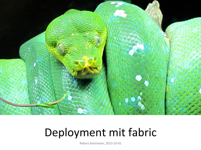 lokalen Rechner aus run() Führt einen Befehl auf dem remote Server aus sudo() Wie run(), aber mit sudo put() Kopiert Dateien vom lokalen Rechner auf den Server get() Kopiert Dateien vom Server auf den lokalen Rechner Bespiele: local(’git pull’)! sodu(’mkdir /var/www/public’)! put (’./*.jpg /var/media’)! Robert Kemmeter, 2013-‐10-‐01