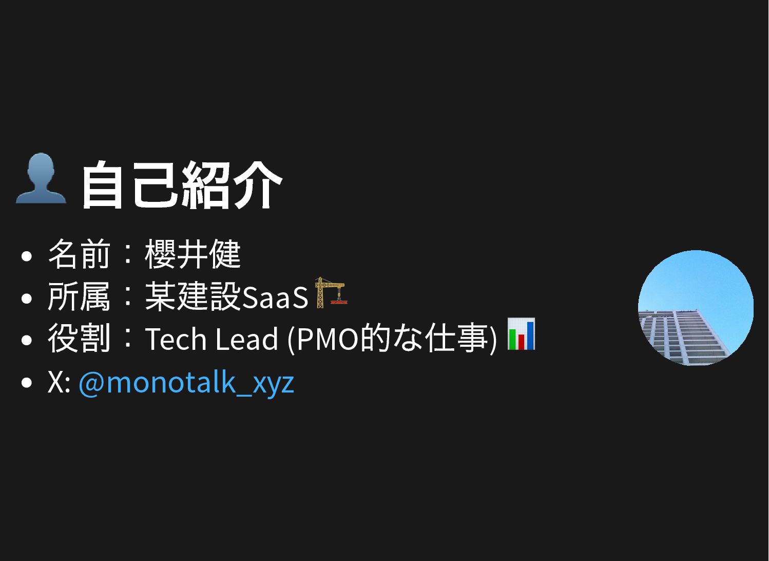 👤 自己紹介 名前:櫻井健 所属:某建設SaaS 🏗️ 役割:Tech Lead (PMO 的な仕事) 📊