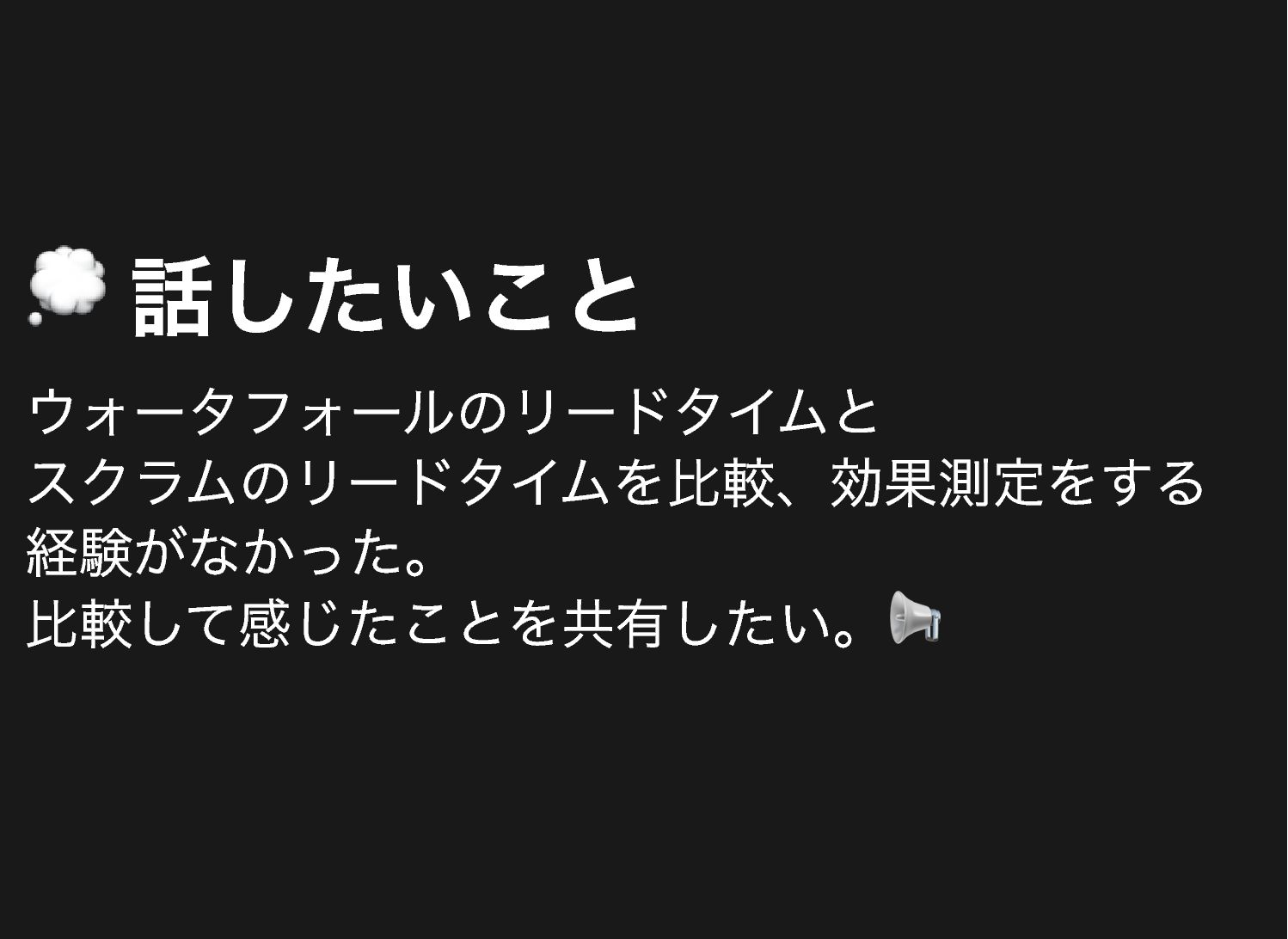 💭 話したいこと ウォータフォールのリードタイムと スクラムのリードタイムを比較、効果測定をする 経験がなかった。 比較して感じたことを共有したい。📢