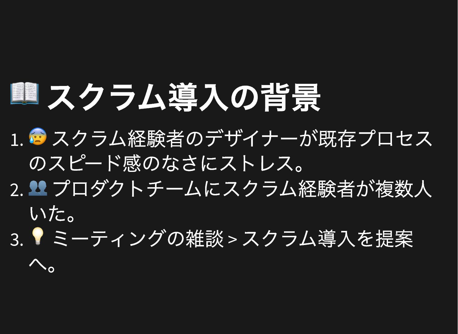 📖 スクラム導入の背景 1. 😰 スクラム経験者のデザイナーが既存プロセス のスピード感のなさにストレス。 2. 👥 プロダクトチームにスクラム経験者が複数人 いた。