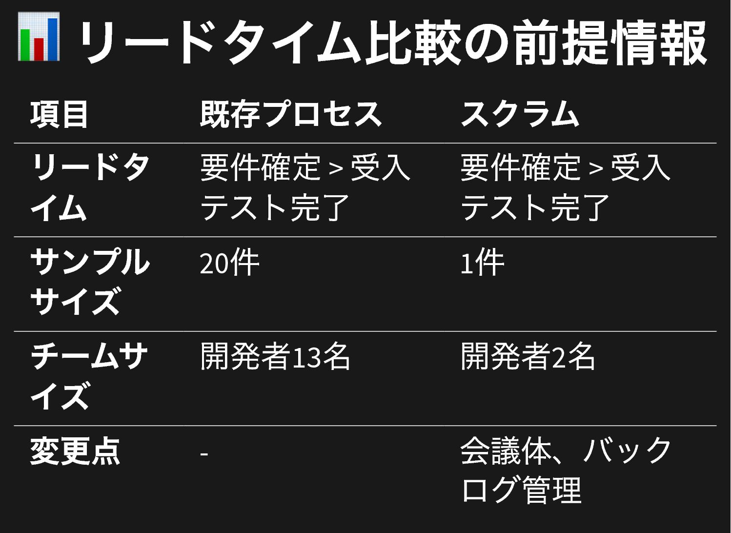 📊 リードタイム比較の前提情報 項目 既存プロセス スクラム リードタ イム 要件確定 > 受入
