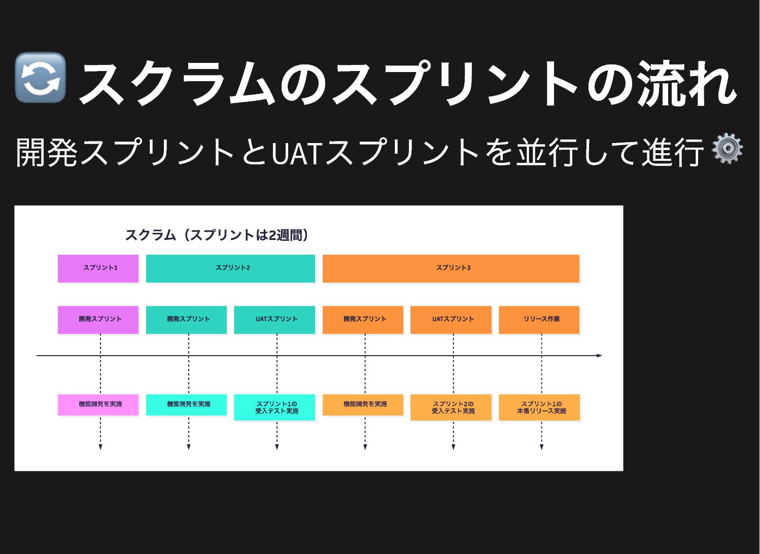 🔄 スクラムのスプリントの流れ 開発スプリントとUAT スプリントを並行して進行 ⚙️ スプリント1 開発スプリント スプリント2 開発スプリント UAT