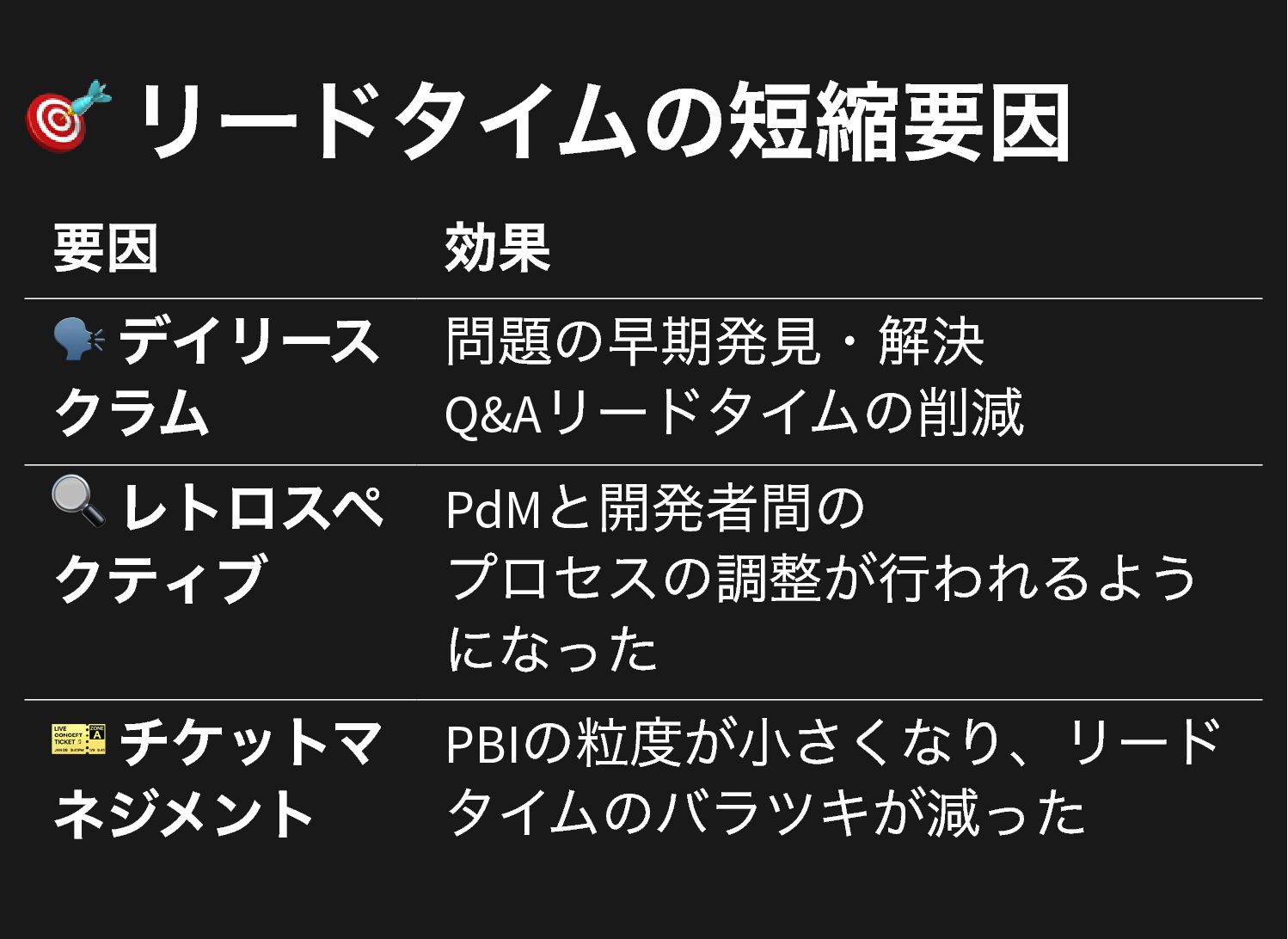 🎯 リードタイムの短縮要因 要因 効果 🗣️ デイリース クラム 問題の早期発見・解決 Q&A リードタイムの削減