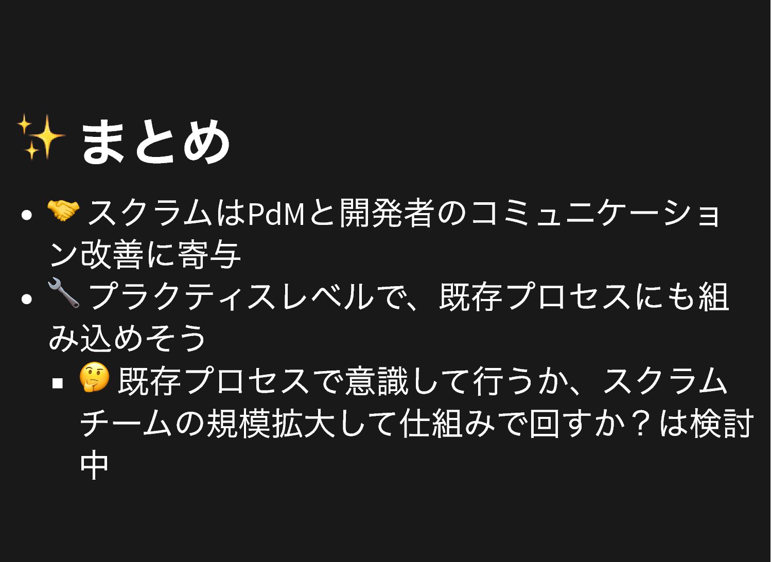 ✨ まとめ 🤝 スクラムはPdM と開発者のコミュニケーショ ン改善に寄与 🔧 プラクティスレベルで、既存プロセスにも組 み込めそう 🤔