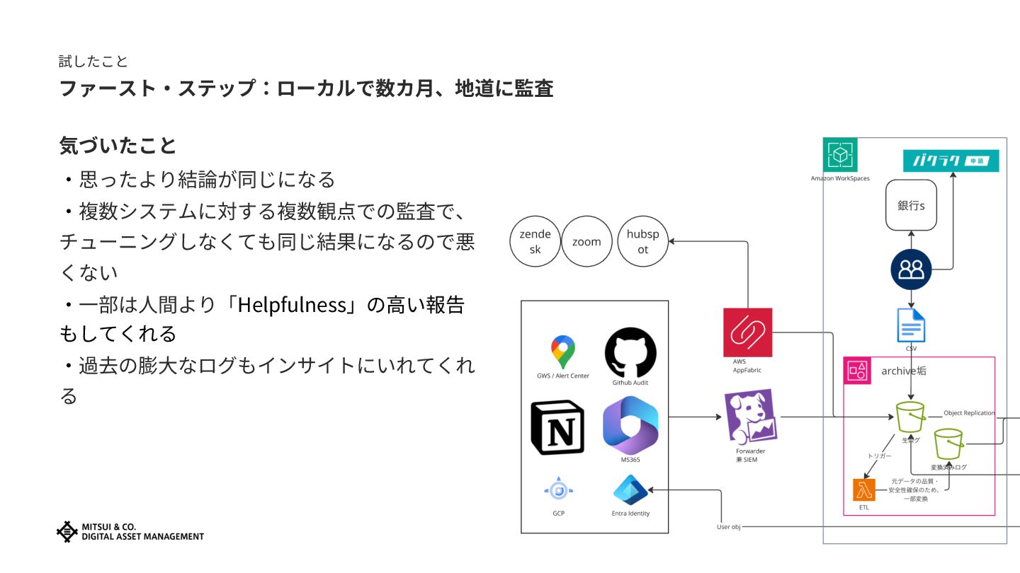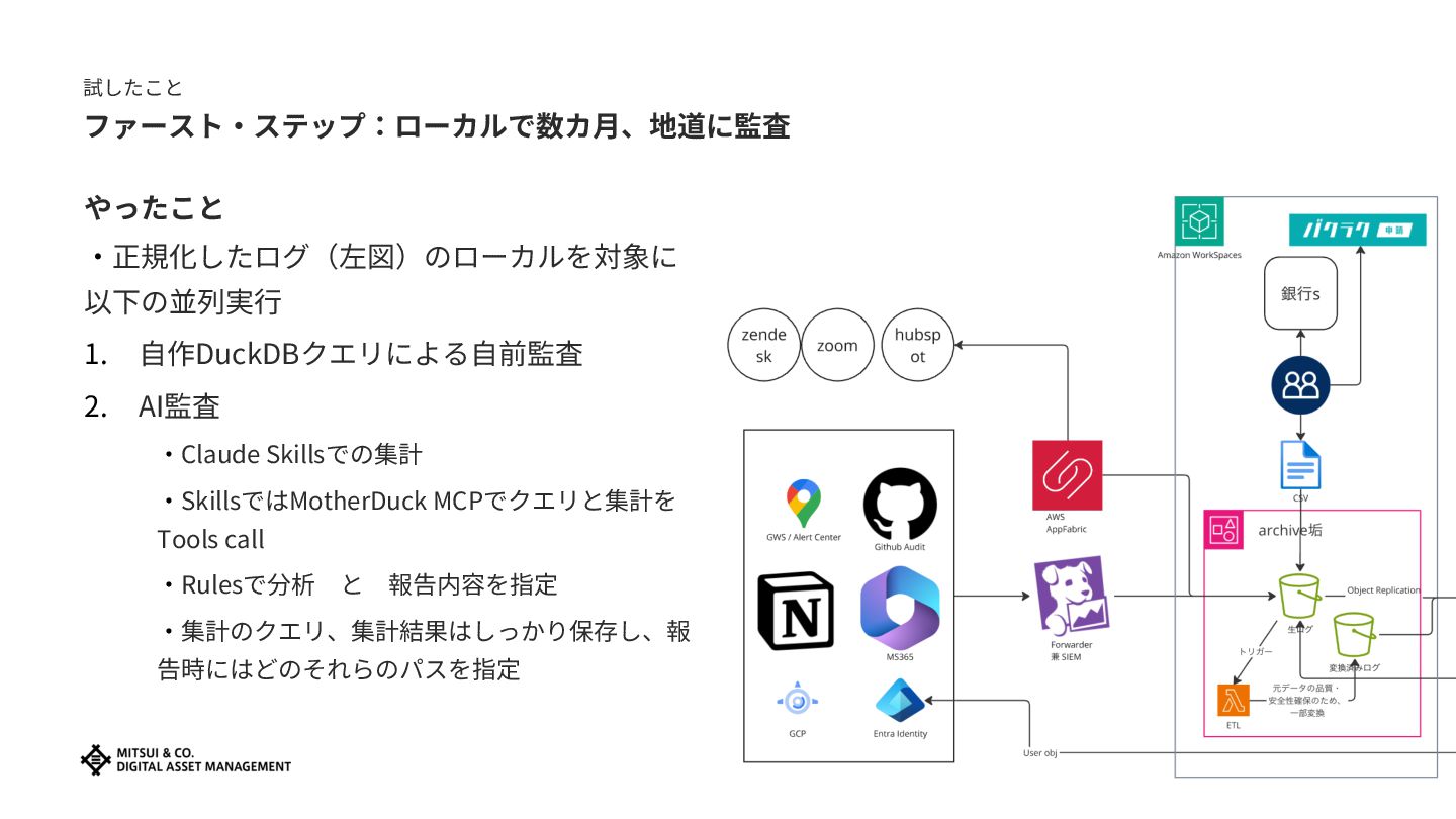 7. 試したこと ファースト‧ステップ:ローカルで数カ⽉、地道に監査 やったこと ‧正規化したログ(左図)のローカルを対象に 以下の並列実⾏ 1. ⾃作DuckDBクエリによる⾃前監査 2. AI監査 ‧Claude