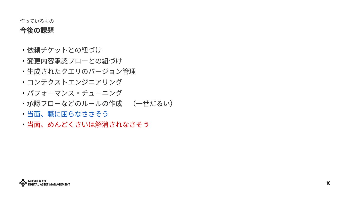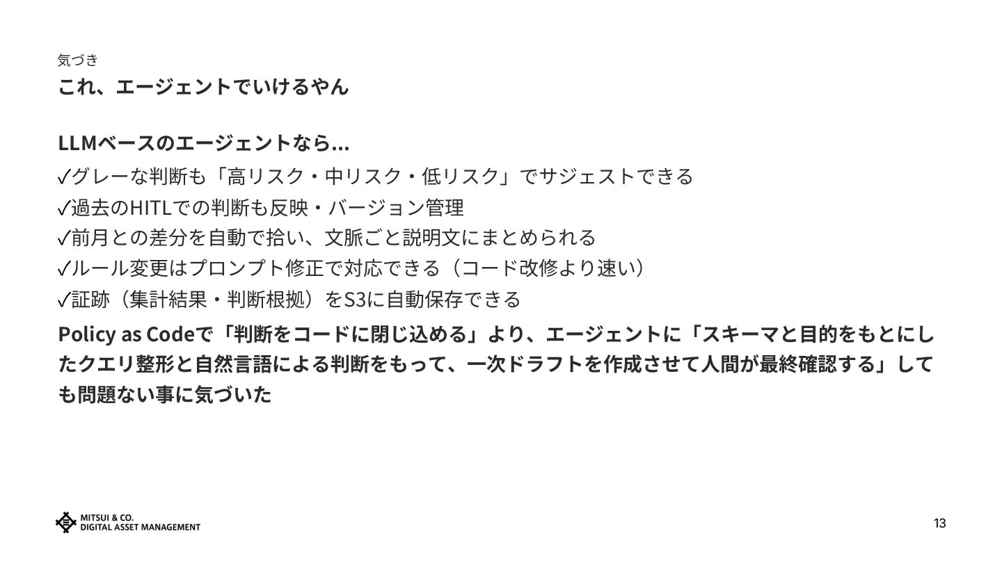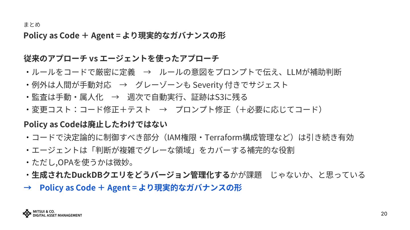 エージェントを使ったアプローチ ‧ルールをコードで厳密に定義 → ルールの意図をプロンプトで伝え、LLMが補助判断 ‧例外は⼈間が⼿動対応 → グレーゾーンも Severity 付きでサジェスト ‧監査は⼿動‧属⼈化 → 週次で⾃動実⾏、証跡はS3に残る ‧変更コスト:コード修正+テスト → プロンプト修正(+必要に応じてコード) Policy as Codeは廃⽌したわけではない ‧コードで決定論的に制御すべき部分(IAM権限‧Terraform構成管理など)は引き続き有効 ‧エージェントは「判断が複雑でグレーな領域」をカバーする補完的な役割 ‧ただし,OPAを使うかは微妙。 ‧⽣成されたDuckDBクエリをどうバージョン管理化するかが課題 じゃないか、と思っている → Policy as Code + Agent = より現実的なガバナンスの形 20