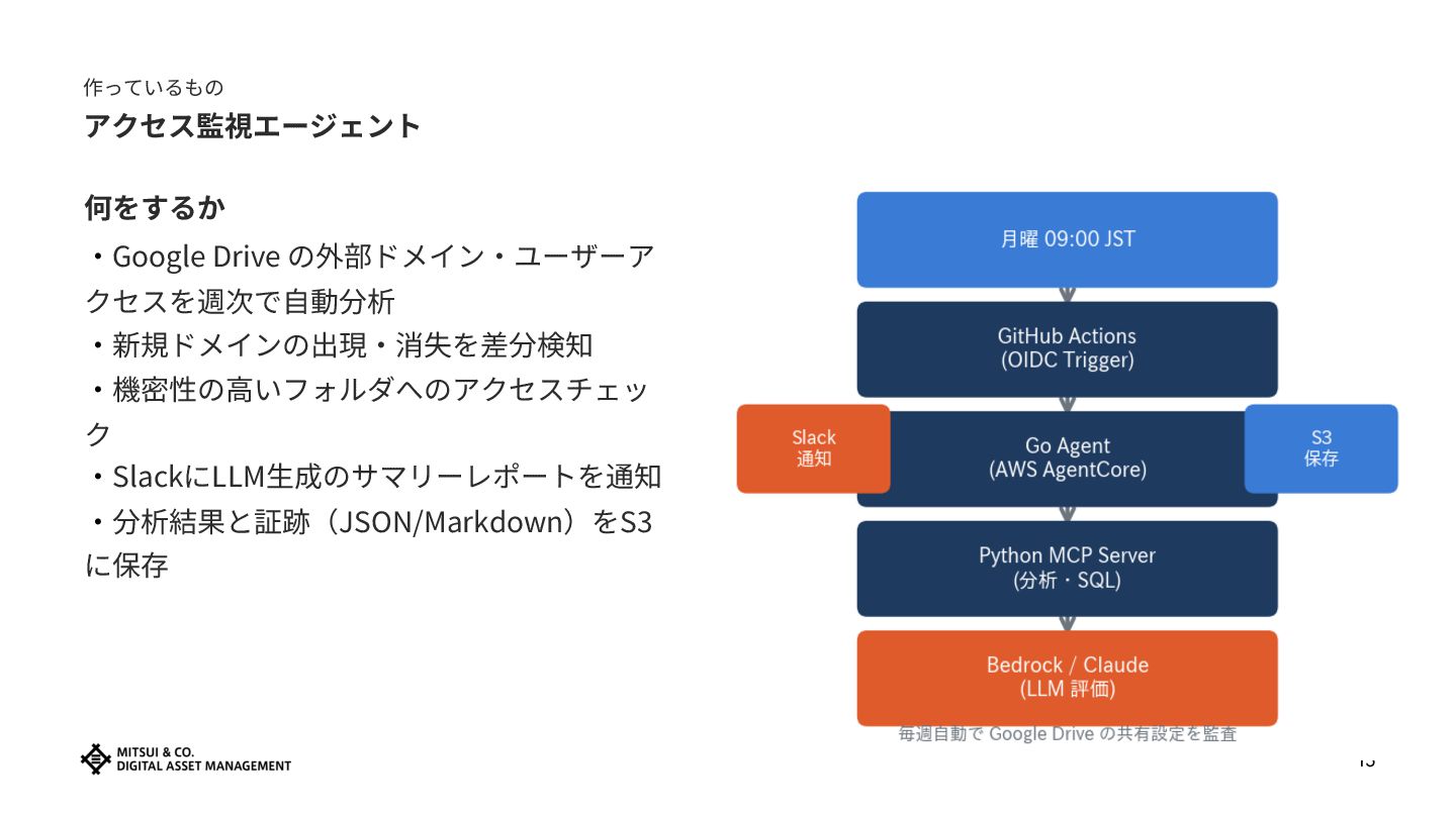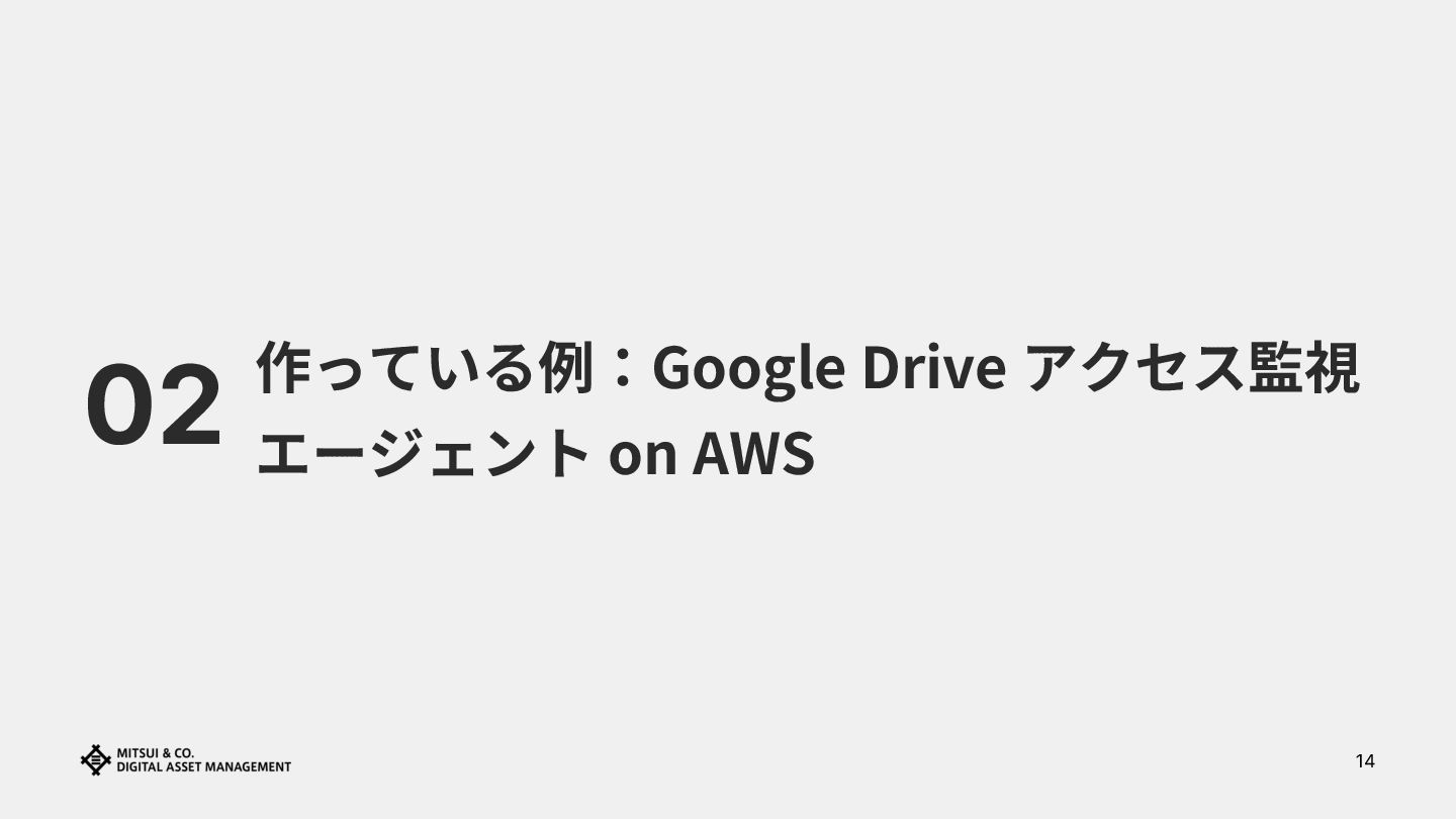 04 気づき:これ、エージェントでいいじゃん 05 作っているもの:Google Drive 監視エージェント on AWS 06 まとめ:Policy as Code + Agent の形